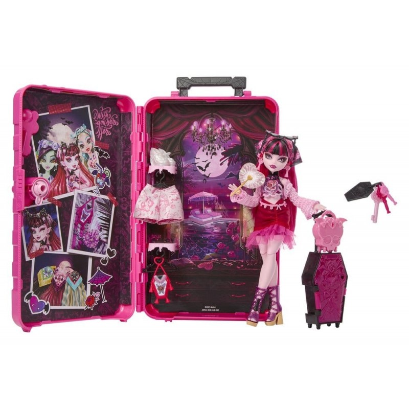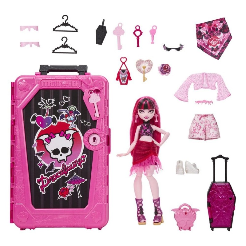 El set incluye una maleta temática en forma de ataúd y más de 19 sorpresas para descubrir, como ropa adicional, zapatos y accesorios que complementan sus vacaciones espeluznantes. Para acceder a estos tesoros ocultos, necesitarás encontrar las tres llaves secretas. Además, el set de Draculaura es perfecto para el juego imaginativo, ya que está totalmente articulada, aunque no se mantiene de pie por sí misma.
