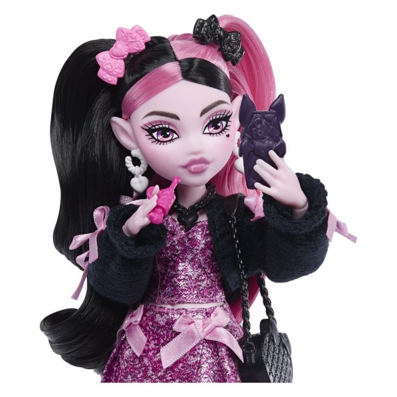 Draculaura viste un conjunto rosa con detalles en negro. Su cabello, mitad rosa y mitad negro, está adornado con lazos y complementos que hacen juego con sus sofisticados pendientes de corazón. Los siete accesorios que incluye hacen de esta muñeca un artículo perfecto para coleccionistas y fans. La muñeca no se mantiene de pie por sí sola, lo que resalta su carácter personalizable y lleno de vida.