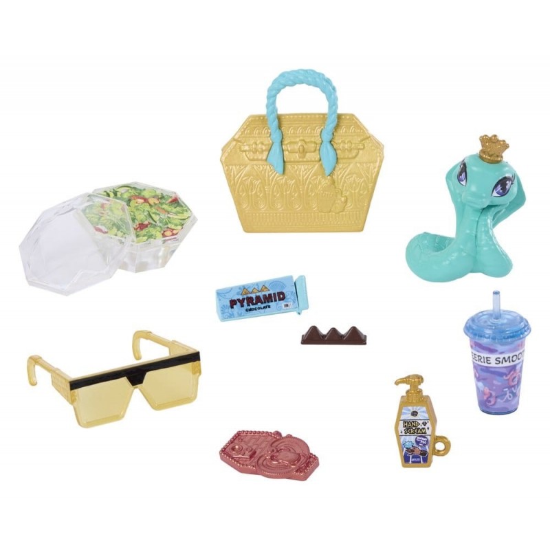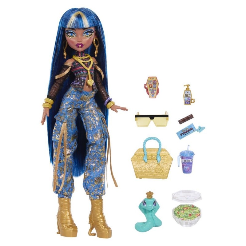 Descubre la muñeca Cleo de Nile de Monster High, perfecta para los jóvenes aventureros. Con un atuendo que combina detalles dorados sobre un diseño azul vibrante, Cleo de Nile luce moderna y única. Incluye siete accesorios, como un bolso dorado, gafas de sol, y su fiel compañera, la serpiente Hissette. Sus pantalones azules decorados con motivos dorados y botas de plataforma doradas completan este look sofisticado. Ideal para niños a partir de 4 años, la muñeca es completamente articulada pero no se mantiene de pie sola. Fabricada por Mattel y con licencia oficial, este juguete es una excelente opción para un regalo original.