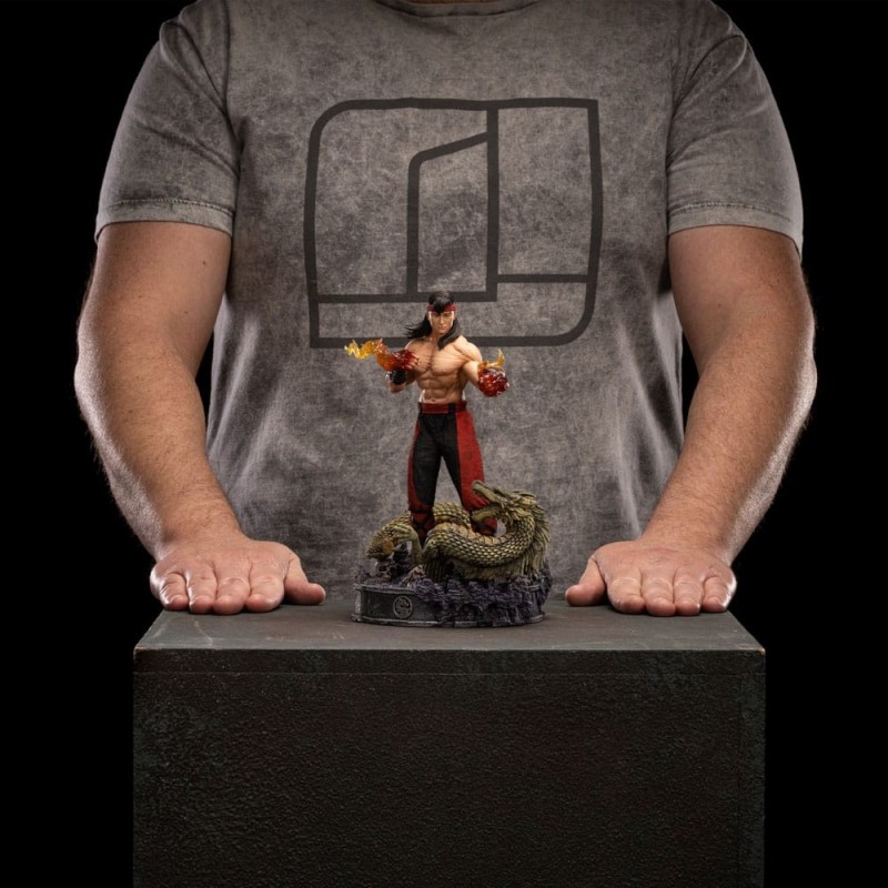 La estatua de Liu Kang a escala 1/10 de Iron Studios captura la esencia del icónico personaje de Mortal Kombat. Esta pieza de poliresina, con un impresionante tamaño de 23 cm, presenta a Liu Kang, el poderoso guerrero, en una pose dinámica con efectos de fuego en las manos, mostrando su habilidad de combate. La figura se erige sobre una base detallada adornada con un dragón, reflejando el estilo y la temática del juego.