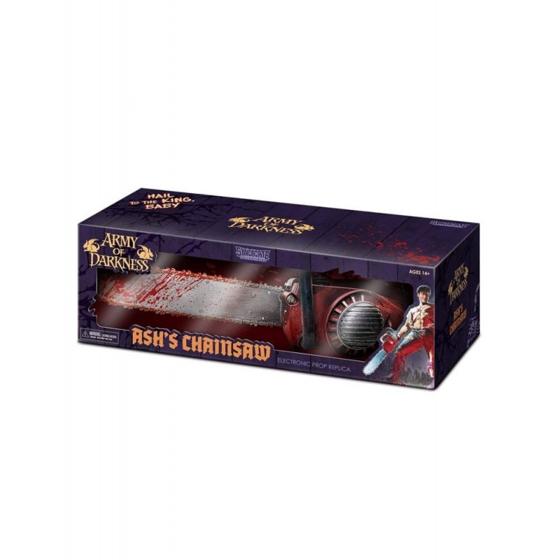 Descubre la réplica a escala 1:1 de la icónica motosierra de Ash Williams de la película "Army of Darkness" o "El ejército de las tinieblas", como se llamó por aquí. Con una medida de 71 cm, esta réplica de Syndicate Collectibles presenta detalles realistas, incluyendo salpicaduras de sangre en la hoja.