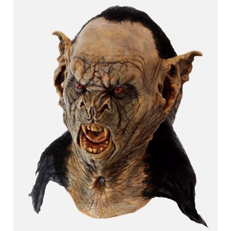 Sumérgete en el mundo de lo sobrenatural con esta Máscara Cabeza Bat Creatures de la reconocida marca GHOULISH. Esta pieza impresionante destaca por su detallado diseño que captura la esencia de una criatura nocturna, con una piel rugosa de tonalidades grisáceas que contrasta con sus penetrantes ojos rojos. Las orejas puntiagudas y la boca abierta revelan colmillos afilados, ofreciendo un efecto visual impactante.