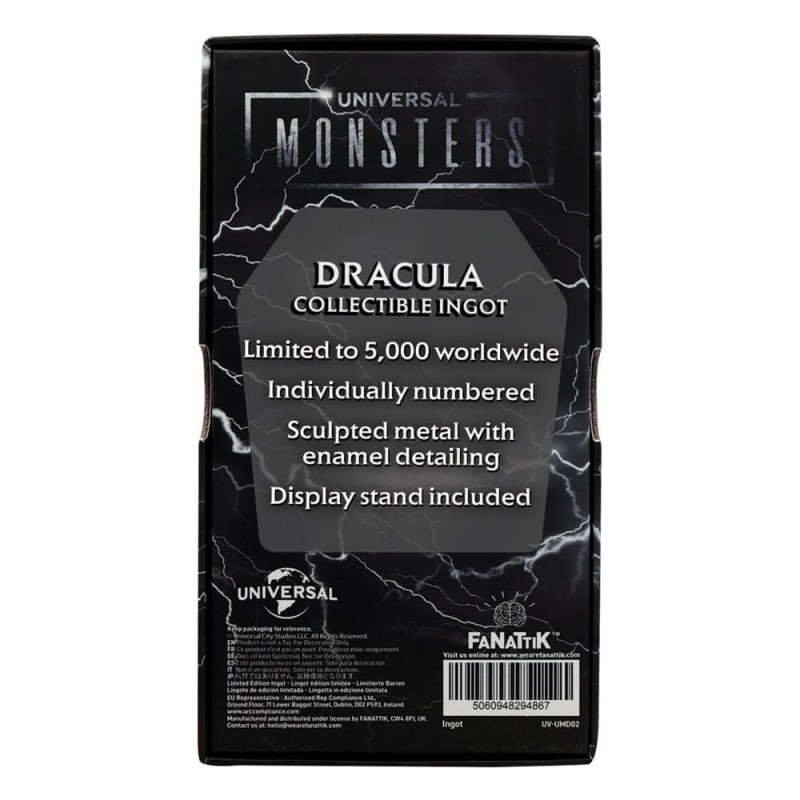 Descubre el lingote coleccionable de Drácula de la serie Universal Monsters, una joya para los amantes del terror clásico. Este impresionante lingote de metal, con una medida de 6 x 13 cm, captura la icónica figura de Drácula emergiendo de su ataúd. La pieza está intricadamente esculpida con detalles esmaltados, destacando su diseño artístico.