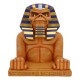 El diseño del bote está cuidadosamente detallado para replicar la figura de un faraón, con un acabado en tonos dorados y azul intenso que evocan la majestuosidad del antiguo Egipto. El rostro, con expresiones marcadas y ojos penetrantes, está elaborado en poliresina de alta calidad, asegurando durabilidad y detalle en cada trazo. Las manos, firmemente posadas al frente, sostienen la estructura que simula ser un sarcófago, imbuido de misterio e intriga.