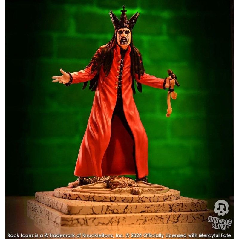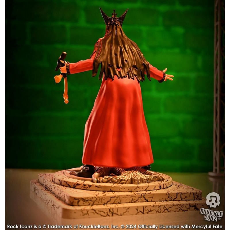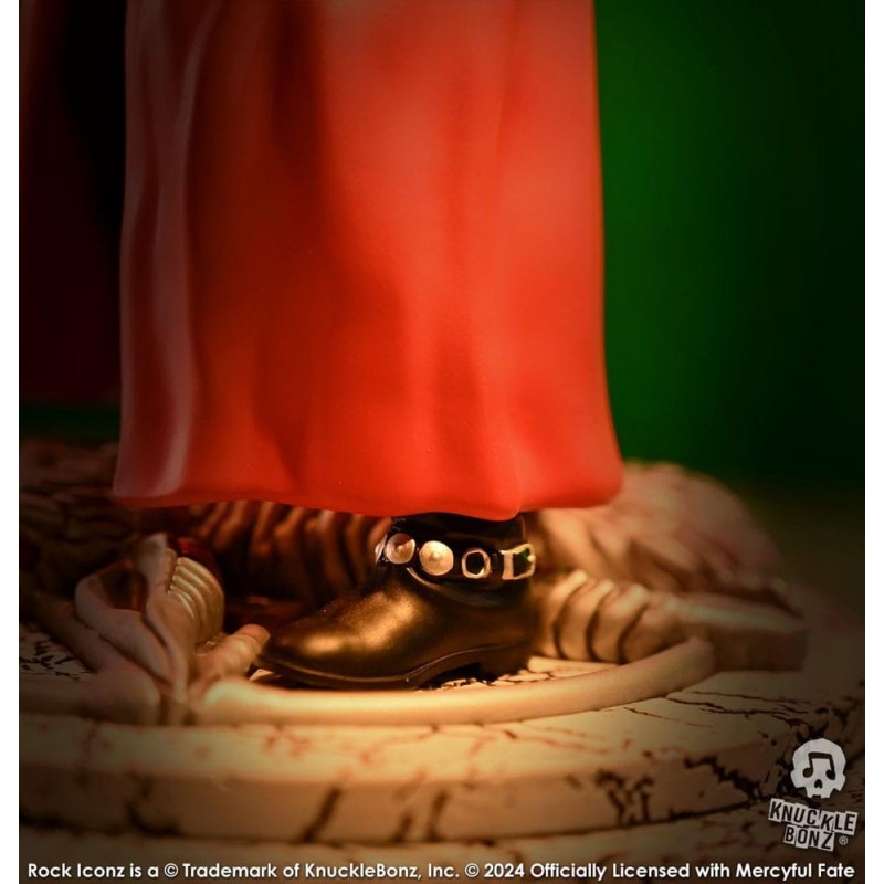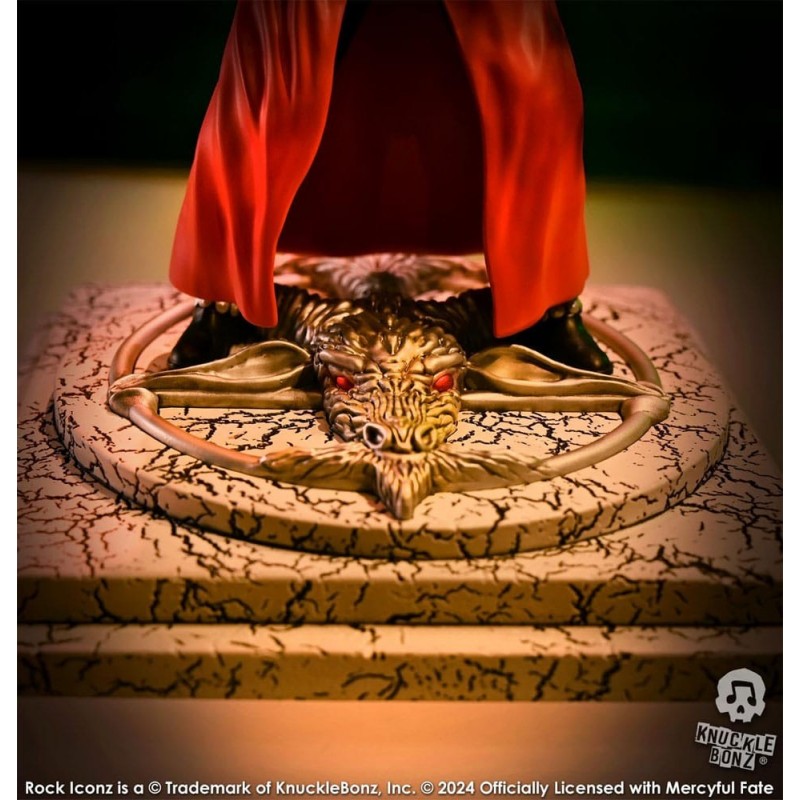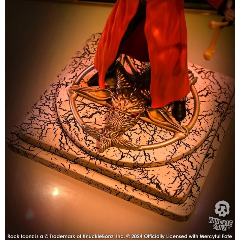 La base de la estatua presenta un diseño intrincado con texturas que evocan una atmósfera mística, ideal para cualquier fan de Mercyful Fate. Como parte de una edición limitada a solo 3000 unidades, cada estatua es un artículo de colección exclusivo.