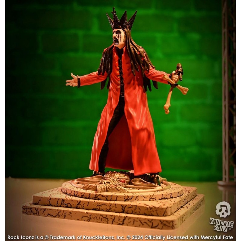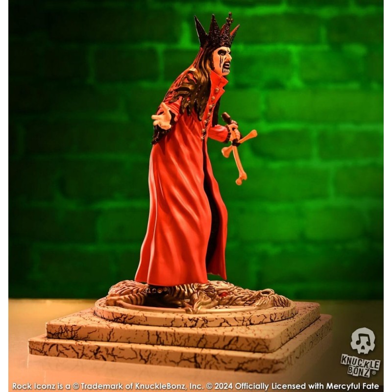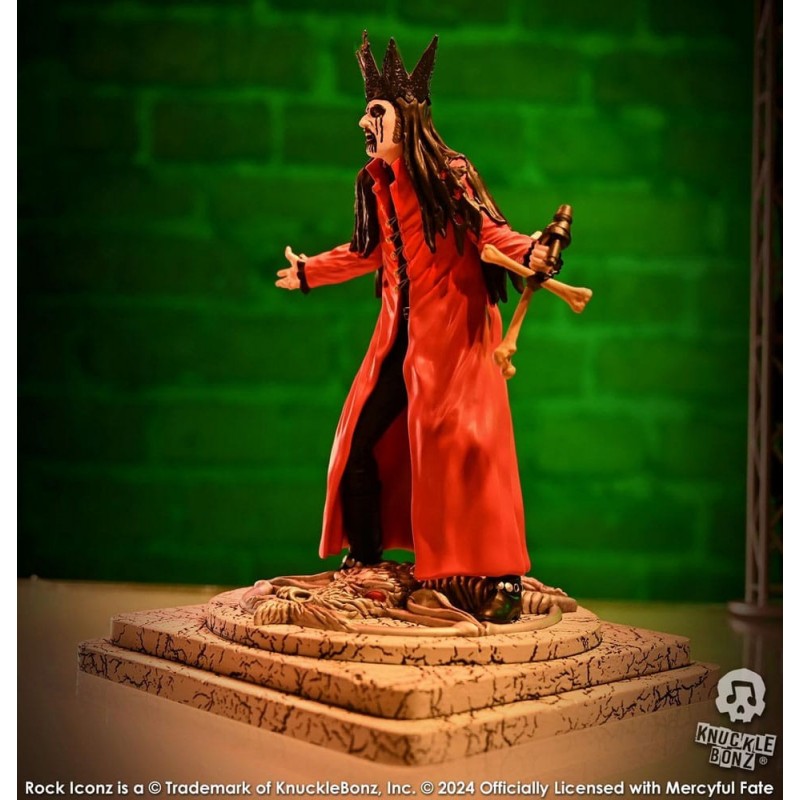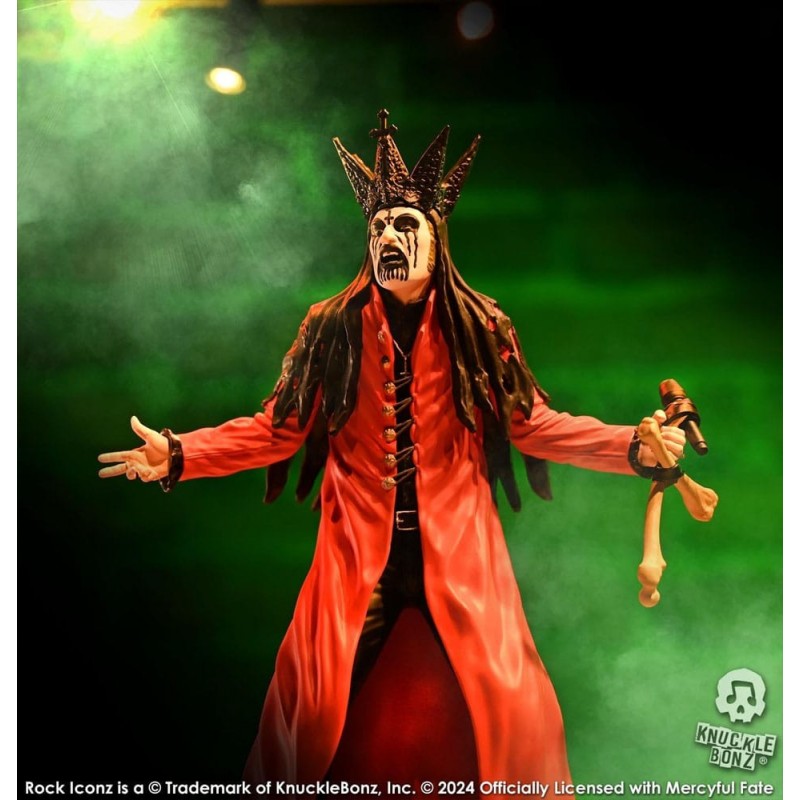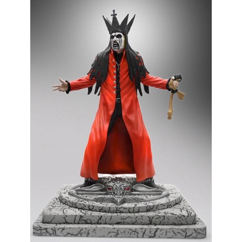 La estatua de King Diamond de Mercyful Fate, parte de la prestigiosa línea "Rock Iconz" de Knucklebonz, es una obra maestra de poliresina. Con un tamaño aproximado de 22 cm, esta pieza captura al icónico cantante en su versión roja. Vestido con una capa roja intensa y una corona negra, el detalle en el maquillaje facial y el micrófono en forma de hueso es excepcional.