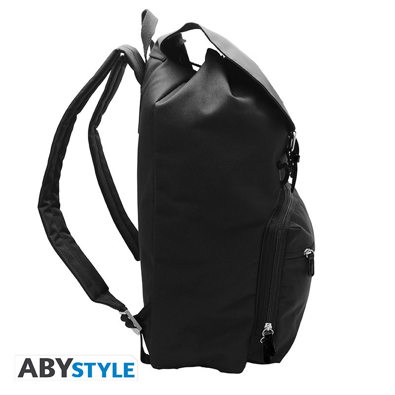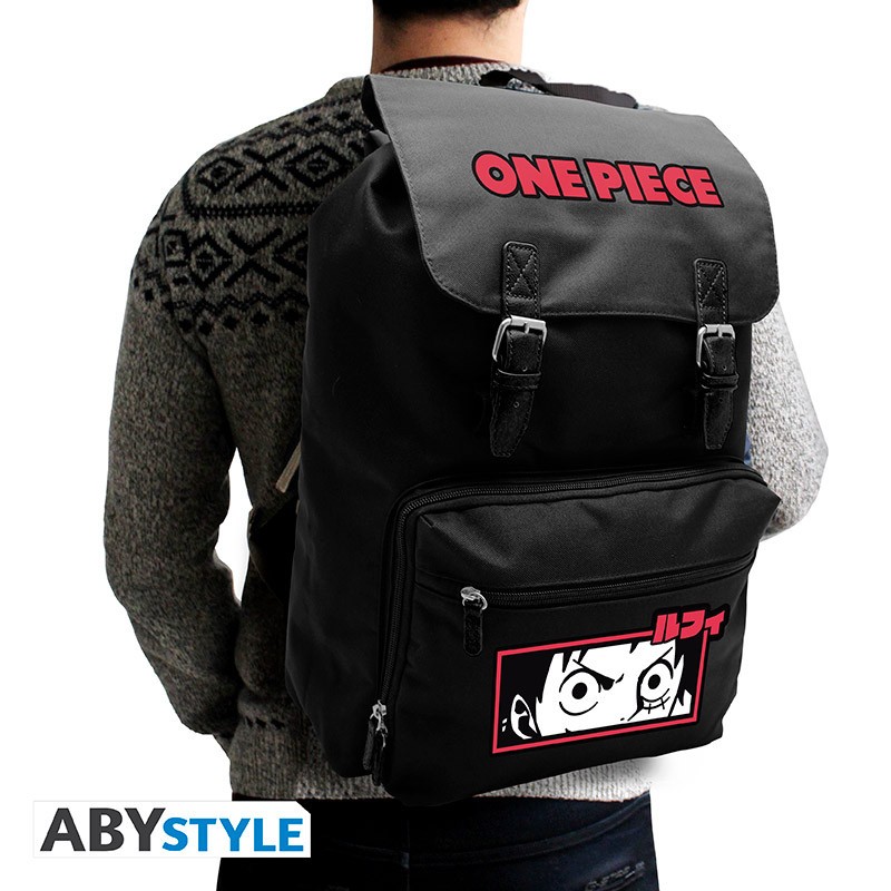 La mochila XXL Luffy ONE PIECE es ideal para los seguidores de esta popular serie de anime. Fabricada por ABYstyle y con licencia oficial, esta mochila combina funcionalidad y diseño auténtico. En un elegante color negro, esta mochila destaca el nombre One Piece en letras rojas en la parte superior, acompañado de una imagen gráfica del rostro de Luffy en blanco y negro con detalles en rojo, ubicada en el bolsillo frontal.