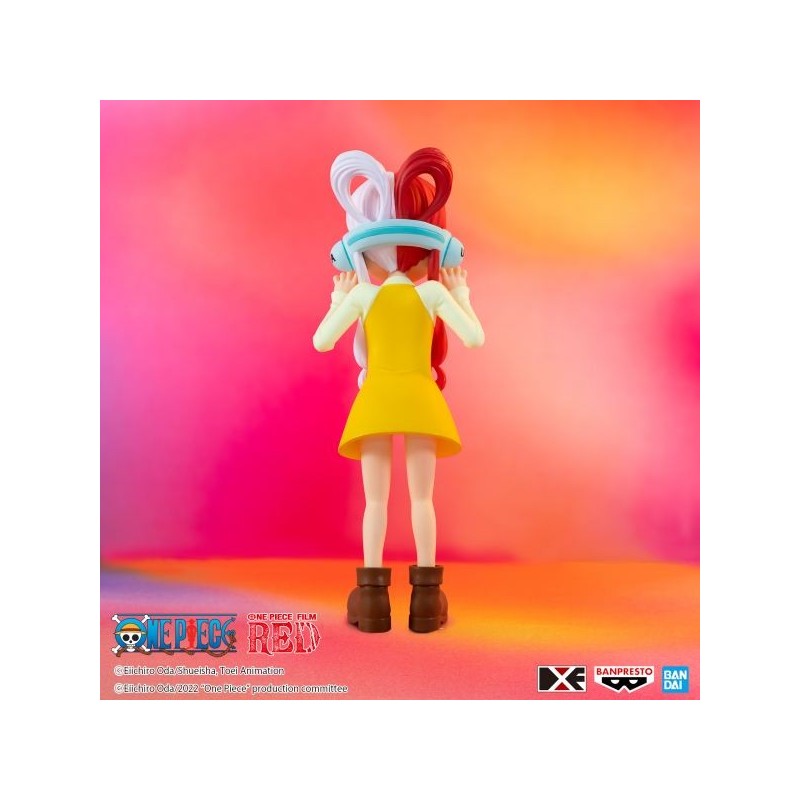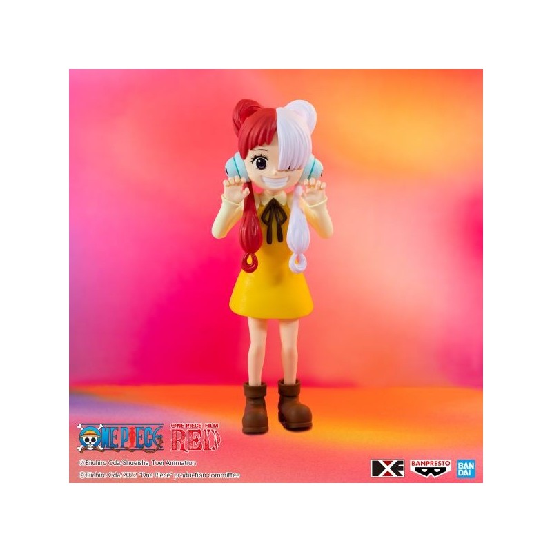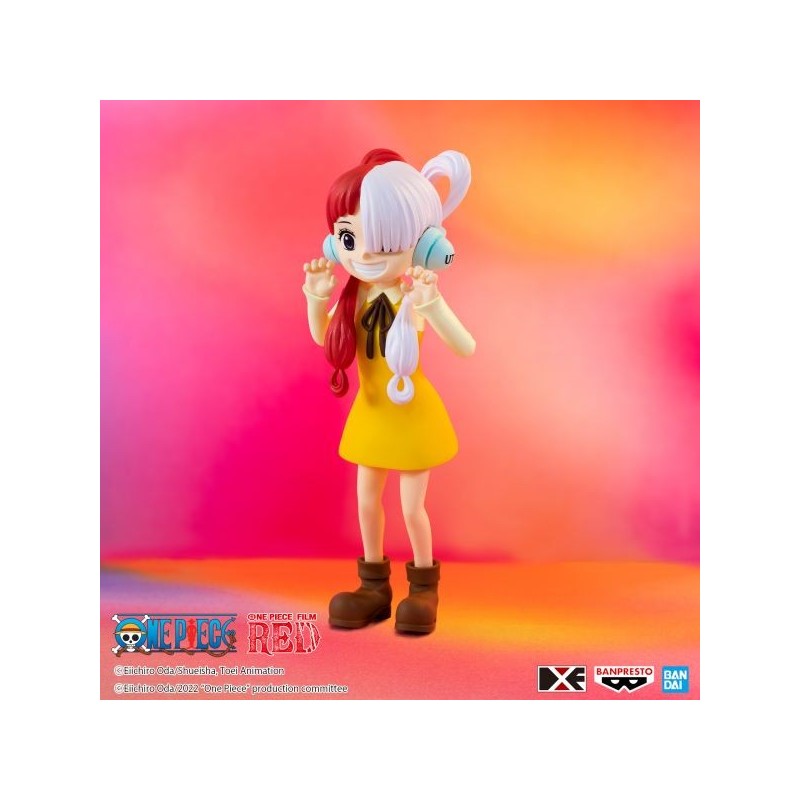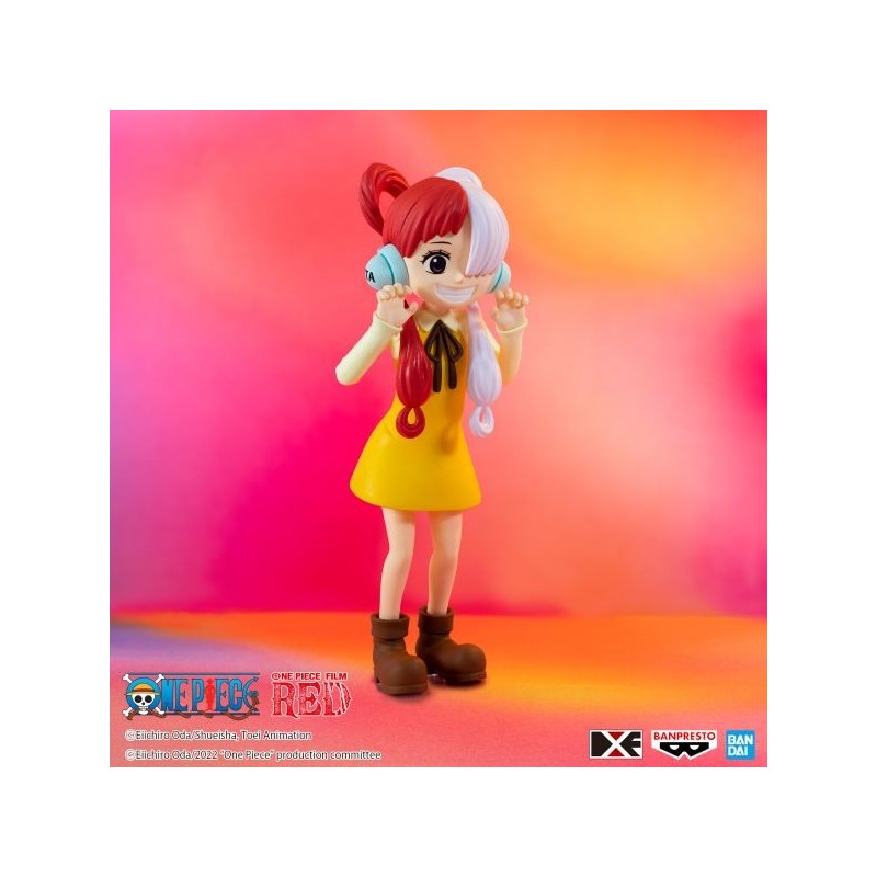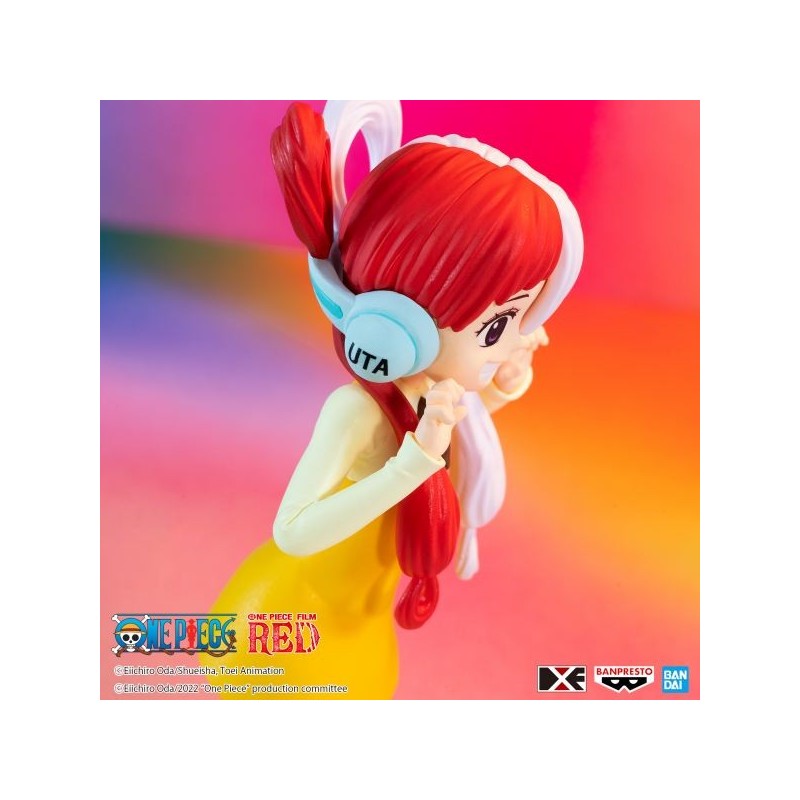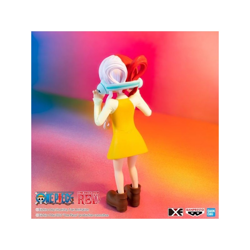 Descubre la encantadora figura de Uta Niño de la serie One Piece Film Red, presentada por Banpresto. Esta figura de PVC pre-pintada mide 12 cm de altura y captura el alegre espíritu del personaje con un diseño detallado. Destaca su peinado bicolor en rojo y blanco, complementado por unos cascos azules y un vestido amarillo vibrante con lazo negro. La figura viene con una base soporte especial que asegura una exposición estable.