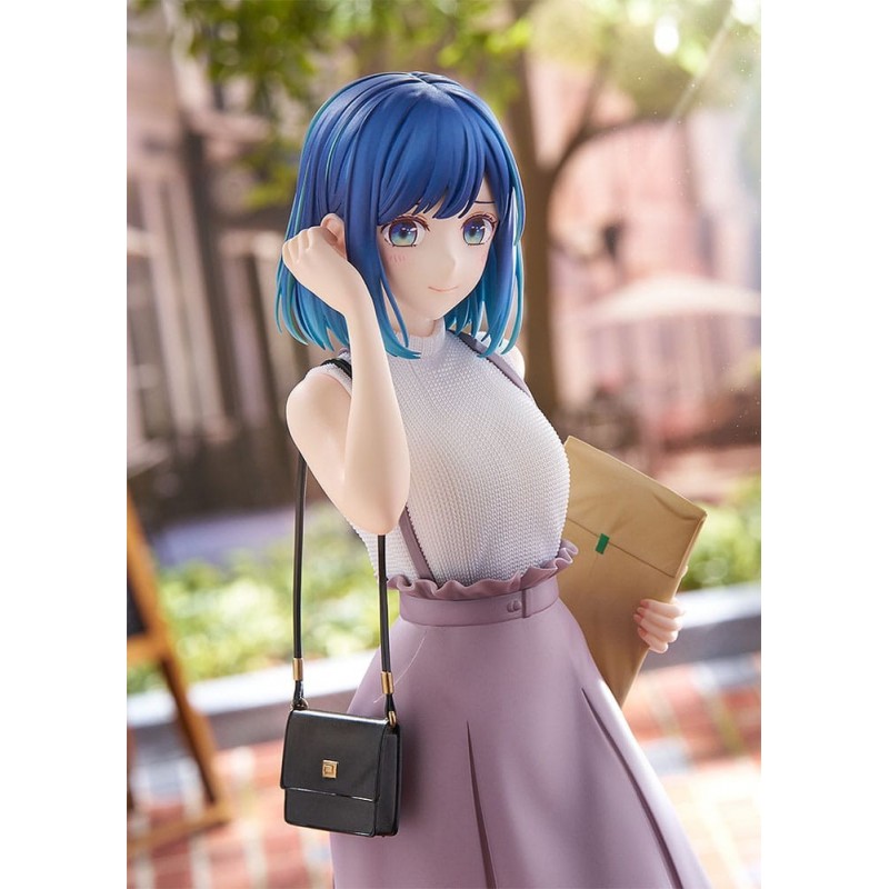 La estatua de PVC de Akane Kurokawa, en su versión Date Style, captura la esencia del personaje de Oshi no Ko con un detalle impresionante. Mide aproximadamente 27 cm de altura y está elaborada por el prestigioso Good Smile Company. Esta figura presenta a Akane vestida con un elegante conjunto compuesto por una blusa blanca sin mangas y una falda lila, complementada por un pequeño bolso negro y zapatos de tacón alto, lo que le da un aire sofisticado y moderno.