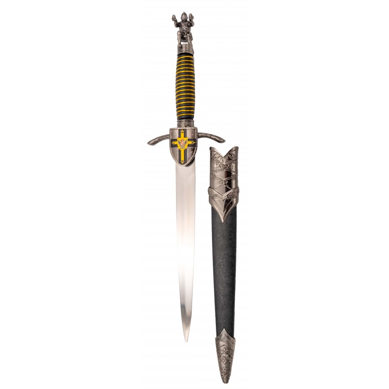 La vaina, de color negro y acabados en níquel, complementa perfectamente el diseño, haciendo de esta daga una pieza digna de colección. Con un peso de 316 gramos, es ligera y manejable, ideal para exhibir en cualquier colección temática de la época templaria.