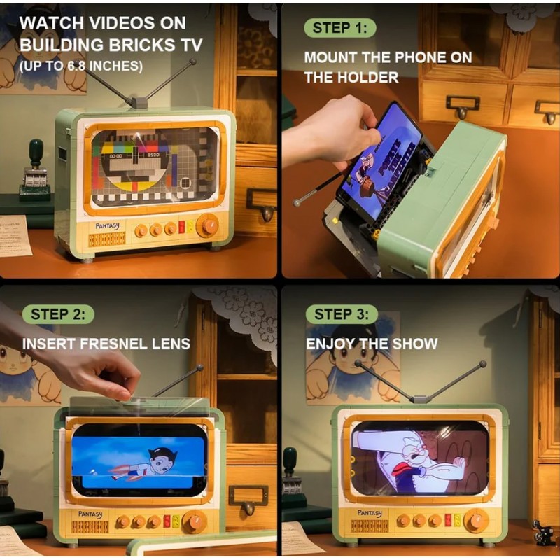 Descubre la maqueta Retro TV Set de la colección Joyside Series de Pantasy, un verdadero homenaje a la nostalgia. Este set de construcción, compuesto por 670 piezas, permite armar una réplica detallada de un televisor retro de 26 cm de altura.