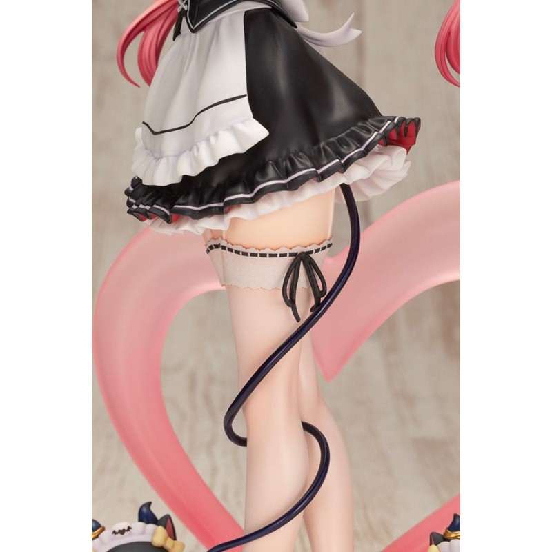 Yuzuki Choco se presenta en un encantador atuendo de maid, con colores predominantemente negros y blancos, acentuados por su largo cabello rubio con toques rosados. La atención al detalle es impresionante, desde el delicado encaje de su vestido hasta los pequeños adornos de sus zapatos de tacón alto en color negro y rojo. Además, esta figura incluye elementos adicionales como platos decorativos y encantadores personajes pequeños, que aportan un toque extra de personalidad.