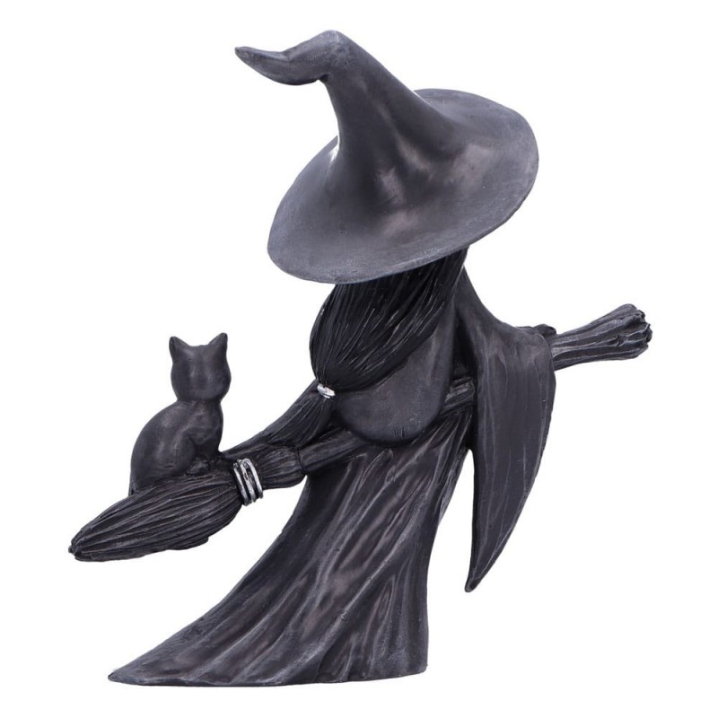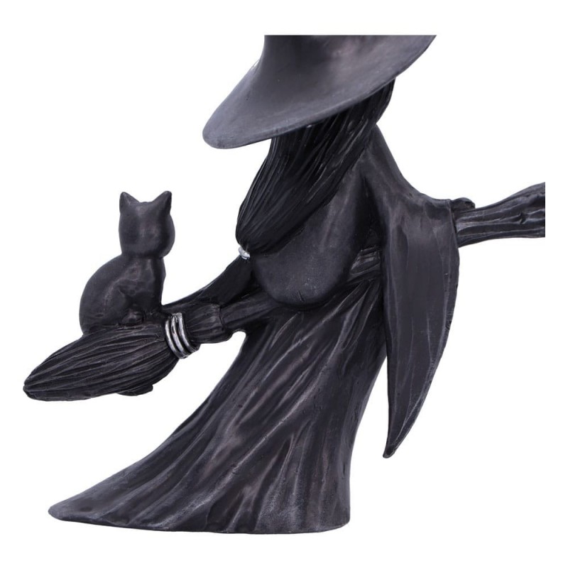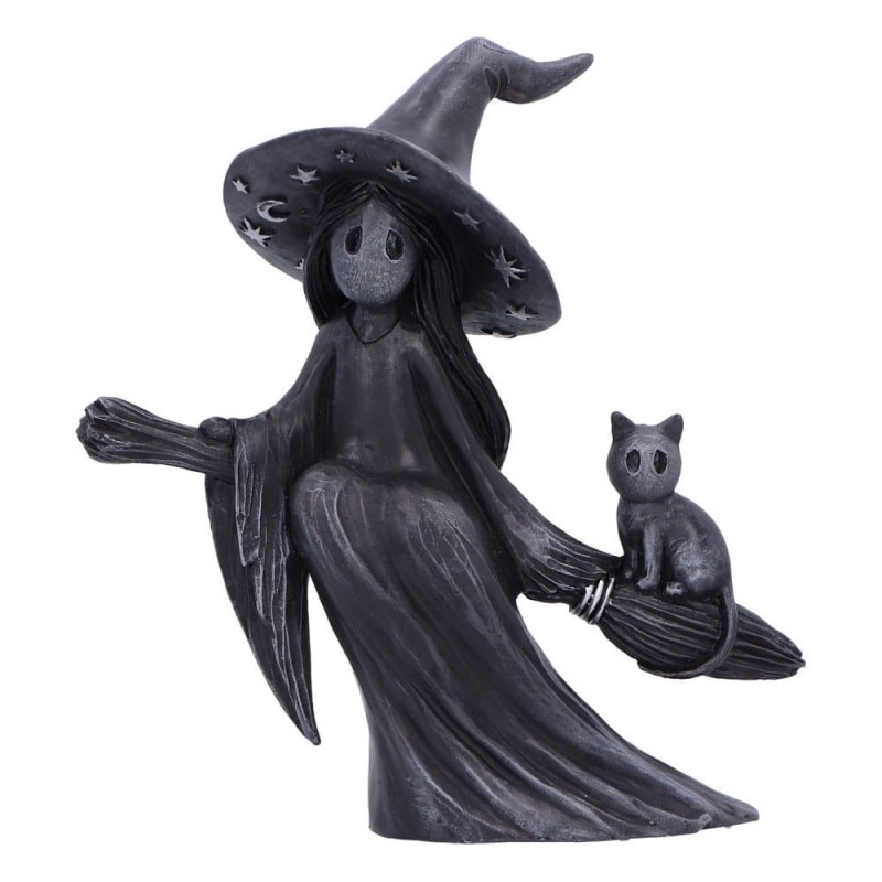 La figura representa a un personaje simpático y misterioso con un sombrero decorado con estrellas y lunares, y acompañada de un adorable gato, ambos viajando sobre una escoba mágica. El diseño en tonos oscuros resalta por su elegancia y estilo, convirtiéndola en una pieza perfecta para añadir un toque de fantasía a cualquier espacio.