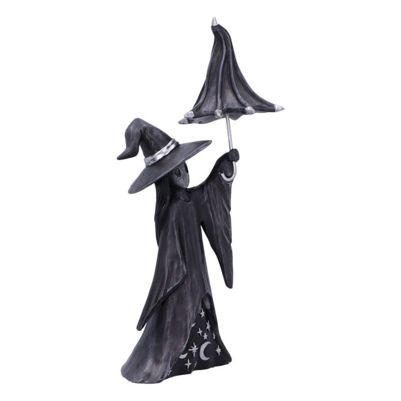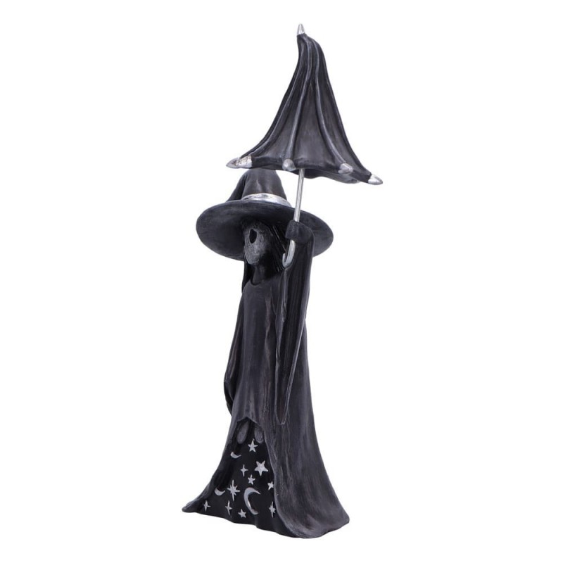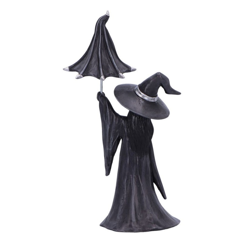El diseño presenta una figura enigmática con un sombrero puntiagudo y un paraguas, evocando un estilo gótico y mágico perfecto para coleccionistas y amantes del arte decorativo. Fabricada por Nemesis Now, esta figura con licencia oficial es ideal para añadir un toque de originalidad a cualquier espacio o para regalar a alguien especial.