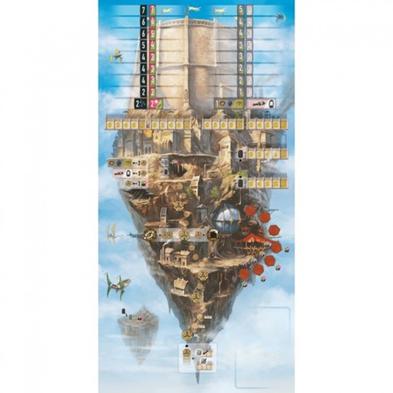 Adéntrate en el fascinante universo de Noria, un juego de mesa donde el futuro de tu imperio comercial está en tus manos. Con un diseño visual impresionante, el juego te invita a explorar islas voladoras y construir un próspero imperio. Las ilustraciones detalladas muestran un mundo flotante lleno de aventura y estrategia.