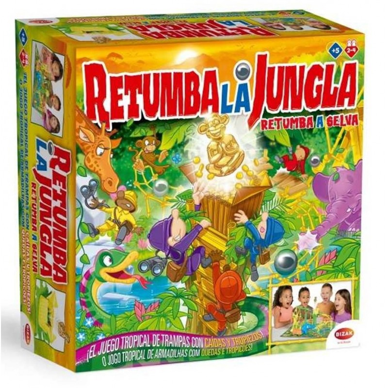 Retumba la Jungla es un emocionante juego de mesa de acción diseñado para los más aventureros. Cada jugador se convierte en un intrépido explorador con la misión de atravesar la jungla y ser el primero en conseguir el codiciado mono de oro. Sin embargo, los astutos monos han sembrado el camino de trampas invisibles, y en cualquier momento, ¡puede retumbar la jungla! El sonido de rocas cayendo amenaza con detener tu avance. Vence estos desafíos y llega al tesoro antes que nadie.