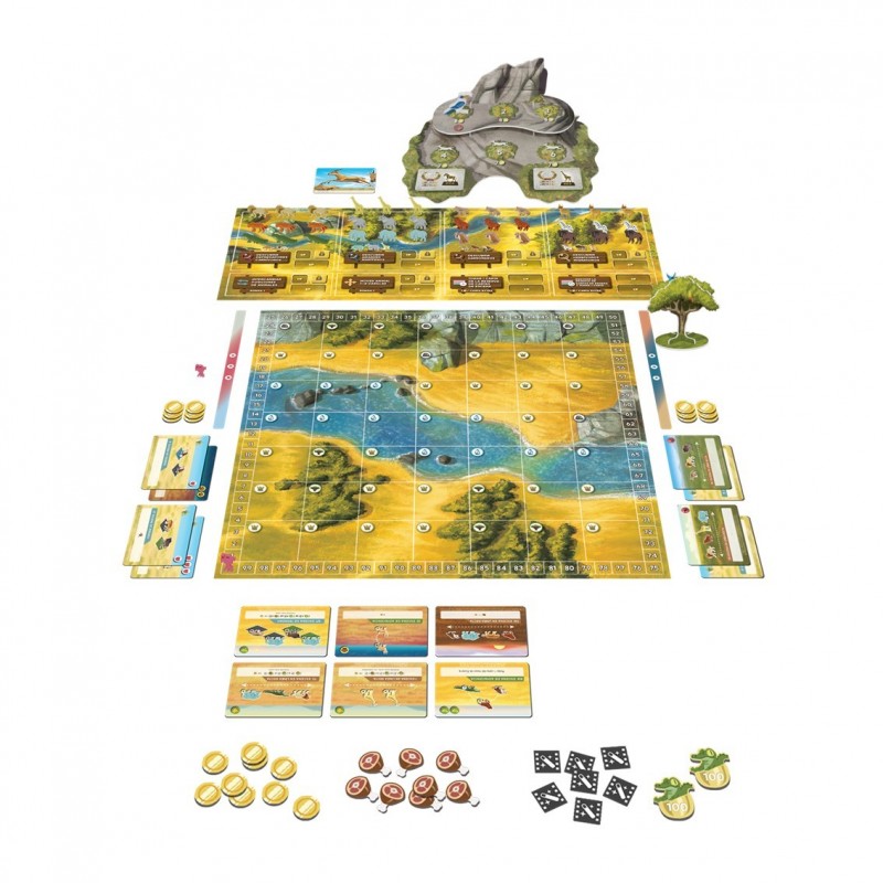 Explora la rica fauna del Serengueti con el juego de mesa Vida Salvaje: Serengeti. Sumérgete en la naturaleza y captura momentos únicos para filmar el documental de tu vida. Conoce a leones, jirafas, gacelas, rinocerontes y muchos más mientras reúnes escenas emocionantes para crear potentes sinergias y mejorar tu puntuación. Adaptabilidad y estrategia son clave en este entorno dinámico, ofreciendo estrategias infinitas y una gran rejugabilidad.