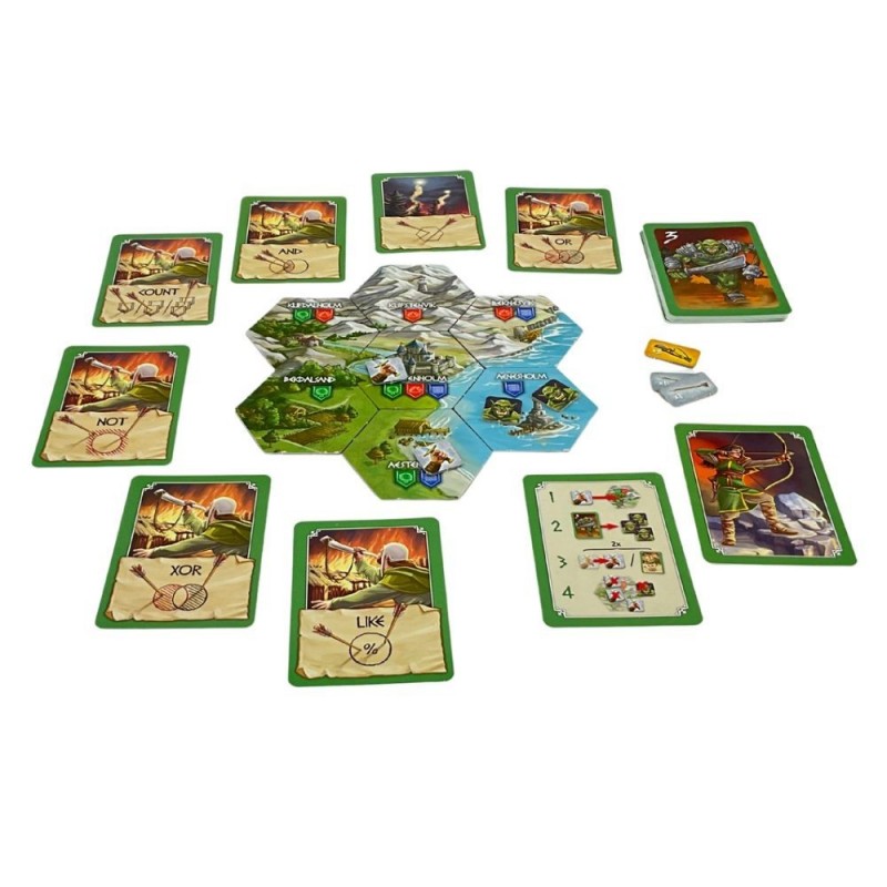 Descubre Arqueras de Nand, un innovador juego de mesa que combina diversión y aprendizaje sobre conceptos básicos de bases de datos. Con una vibrante caja verde ilustrada con arqueras y orcos, este juego te invita a proteger el Valle de Nand de las hordas salvajes mediante cartas de operaciones como AND, OR, XOR, y más.