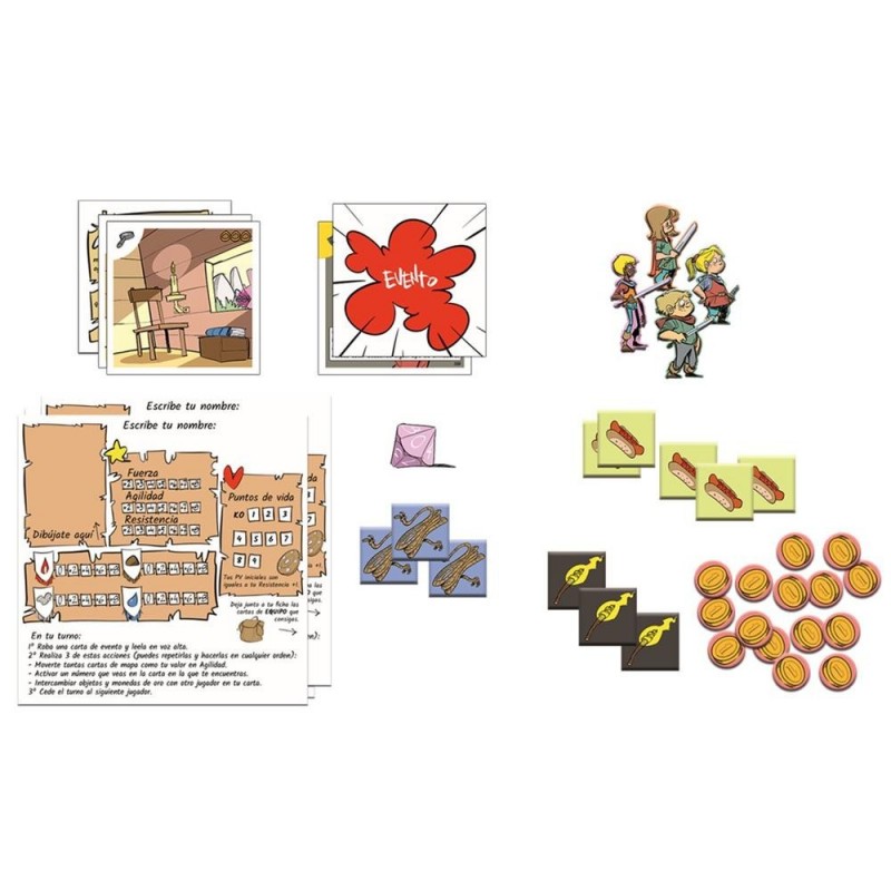 El juego incluye un reglamento, dado, 4 peones, 26 contadores, 168 cartas de aventura, un mapa, 53 cartas de eventos y 4 fichas de jugador. Todo lo necesario para horas de diversión. Con una duración de 1 a 7 horas, cada partida será una nueva aventura llena de sorpresas.