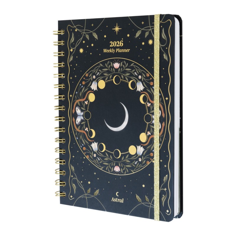 Descubre la agenda anual 2026 de diseño astral, ideal para mantener tu organización con estilo. Con un formato A5 (14,8 x 21 cm) y vista semanal, es perfecta para planificar tus semanas de enero a diciembre. Presenta una cubierta de tapa dura con elegante encuadernación wire-o que asegura durabilidad.