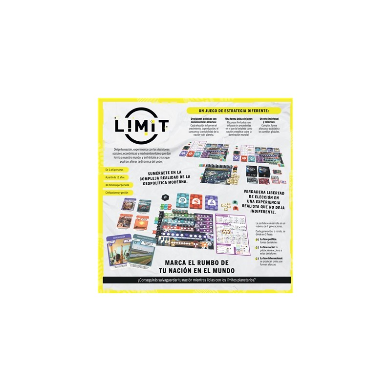 Descubre Limit, un juego de estrategia geopolítica que te reta a liderar una nación en un mundo de recursos limitados y cambios globales. Ambientado entre 1850 y 2060, este juego para 1-6 jugadores te sumerge en decisiones críticas que impactan en la población y el equilibrio internacional. Con una duración de 80 a 120 minutos, cada partida te permite experimentar una simulación estratégica realista y profunda.