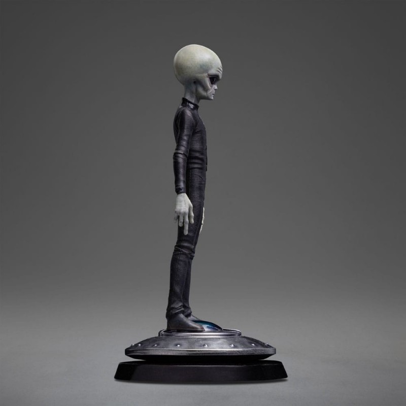 Con unas dimensiones aproximadas de 21 x 11 x 11 cm, esta estatua representa a un alienígena de piel gris y grandes ojos negros, vestido en un traje espacial oscuro que acentúa su apariencia misteriosa y enigmática. El alienígena se encuentra sobre una base que simula un platillo volador, proporcionando estabilidad y un efecto visual impactante.