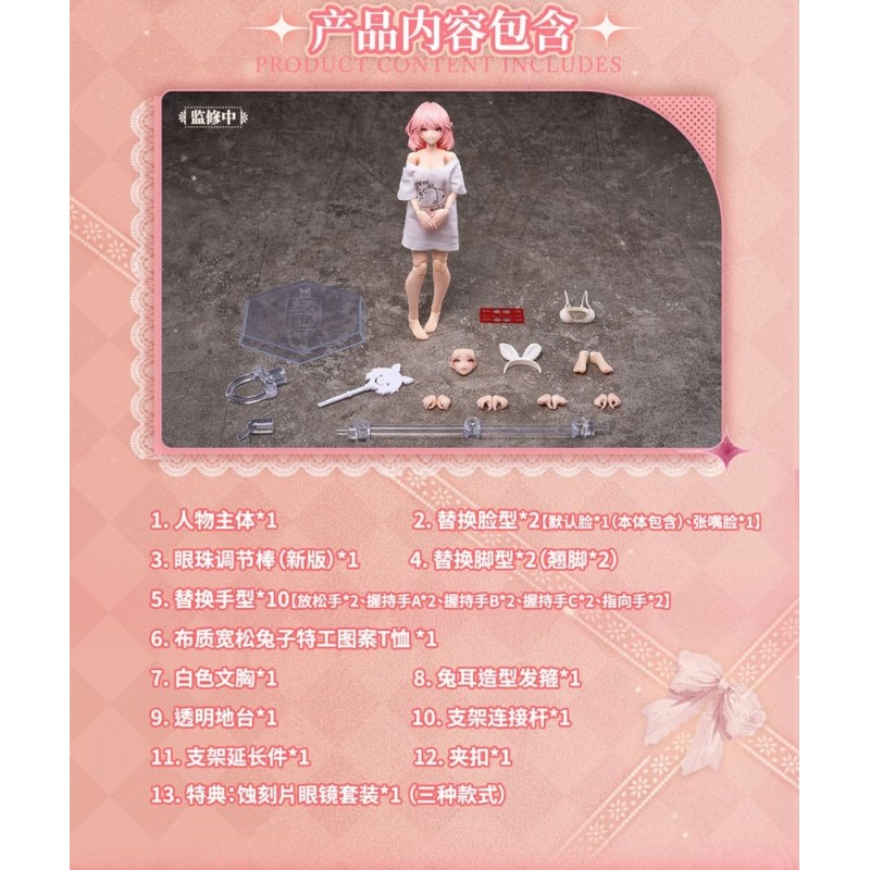 El conjunto incluye una diadema de orejas de conejito, una camiseta temática y un sujetador. Además, trae una base transparente para exposición, asegurando estabilidad. Para mejorar la experiencia visual, se incluyen gafas fotograbadas, permitiendo un realismo impresionante.