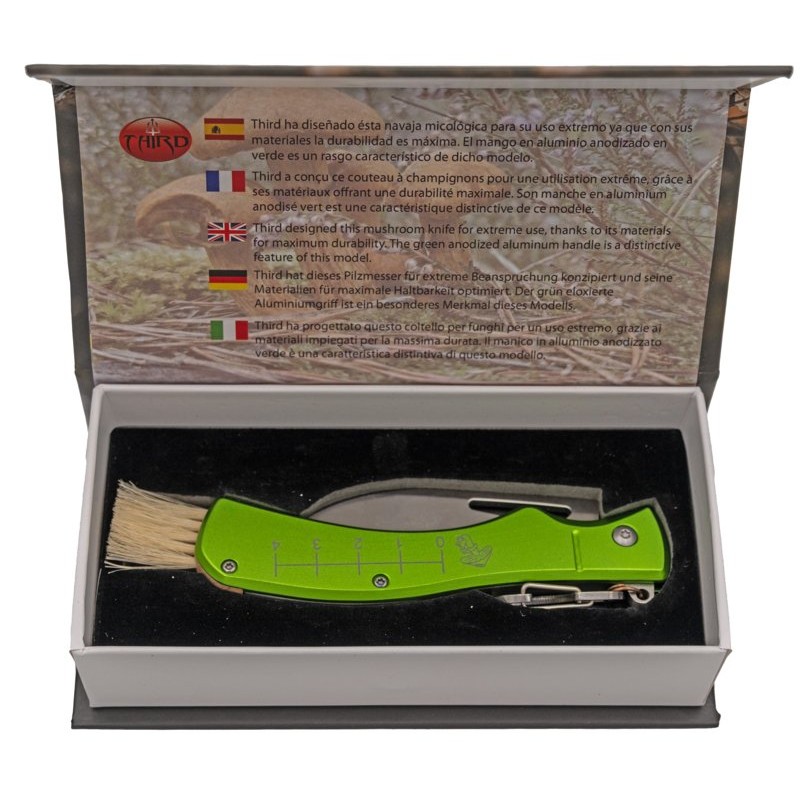 La Navaja para setas Third N207 es el compañero ideal para los amantes de la micología. Diseñada con un mango de aluminio anodizado en verde, ofrece un agarre cómodo y duradero, resaltado por un medidor impreso y un dibujo de seta que le da un toque único.