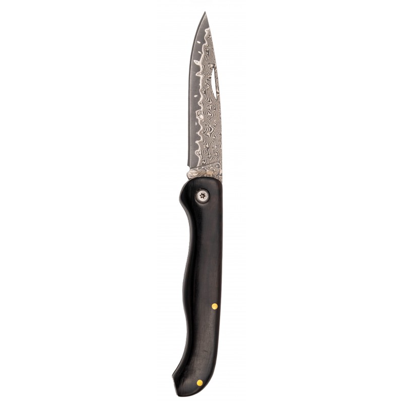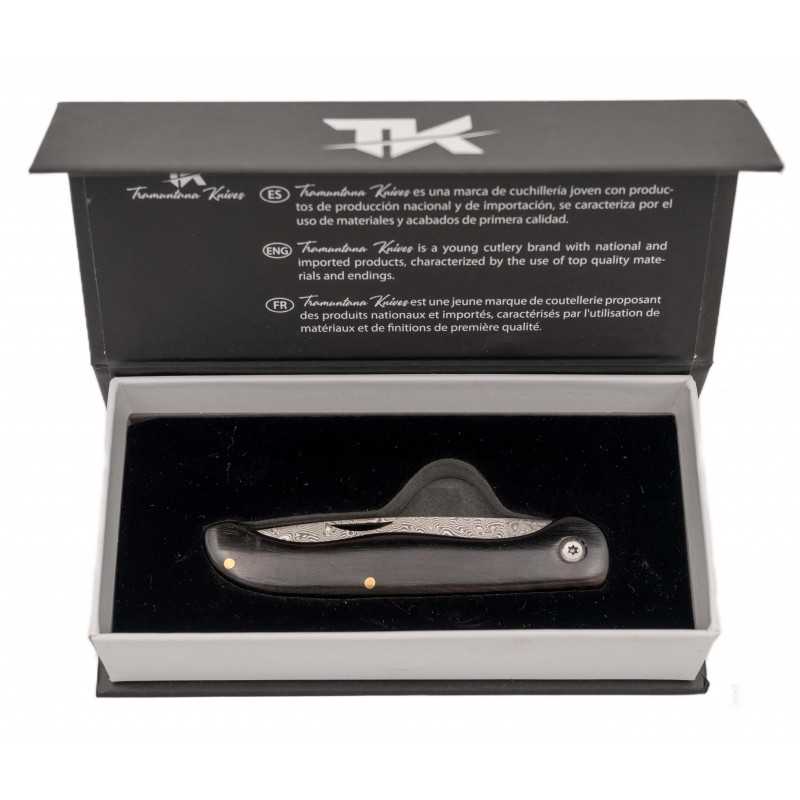 La navaja de acero de damasco Tramuntana N202E combina elegancia y funcionalidad en un diseño excepcional. Su hoja de acero damasco VG10 está compuesta por 67 capas, ofreciendo una resistencia y durabilidad impresionantes. Con un tamaño de hoja de 8 cm y un grosor de 1,9 mm, es ideal para cortes precisos. El mango de madera de ébano, de 10,5 cm, aporta un toque de lujo y una ergonomía perfecta, facilitando su uso. El largo total de la navaja es de 18,5 cm, con un peso de apenas 72 gramos, lo que la hace ligera y manejable. Presentada en una elegante caja, es el regalo original perfecto para entusiastas y coleccionistas.