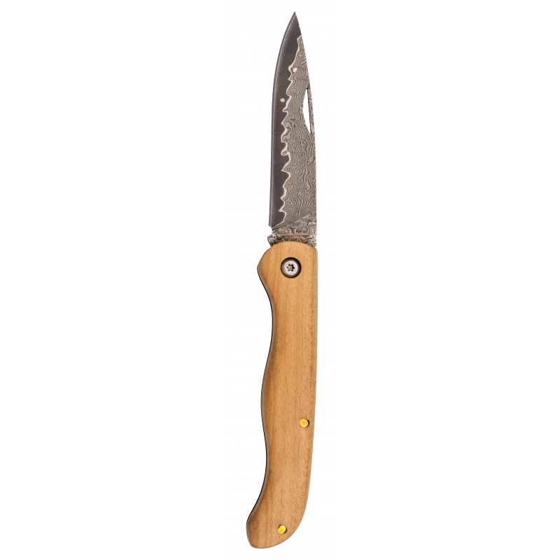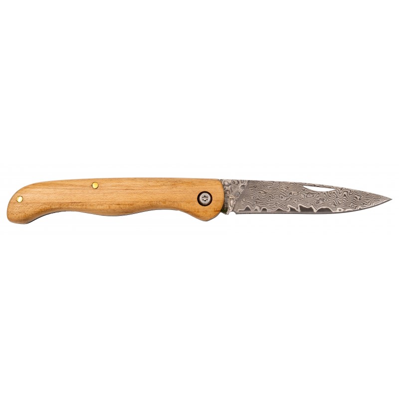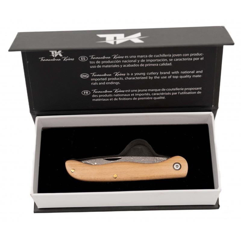 La navaja de acero de damasco Tramuntana es una joya para los amantes del cuchillo. Con un mango de madera de Arce que ofrece un agarre cómodo y elegante, esta navaja se convierte en un artículo indispensable. Su hoja de acero de damasco VG10 de 67 capas muestra un patrón hipnótico que no solo es atractivo visualmente, sino que también garantiza una resistencia y durabilidad excepcionales. La hoja mide 8 cm con un grosor de 1,9 mm, y ofrece un corte preciso de hasta 7,5 cm. El mango tiene un tamaño ideal de 10,5 cm, asegurando un manejo práctico y seguro, mientras que su peso ligero de 64 gramos la hace fácil de transportar. Además, viene con una elegante caja de presentación, ideal para regalar o para coleccionistas. Esta navaja no solo es una herramienta funcional, sino también una pieza de colección que destaca por su diseño y calidad.