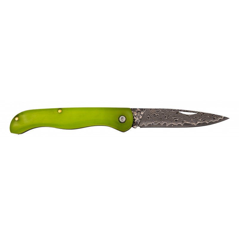 El mango de plástico verde fluorescente no solo es visualmente impactante sino también funcional, asegurando un agarre seguro y ergonómico con sus 10,5 cm de largo. La navaja tiene un peso de solo 64 gramos, lo que la hace ligera y fácil de transportar.