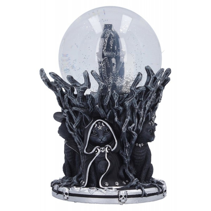 El centro del globo está dominado por un intrincado diseño de pentagrama, rodeado de figuras de gatos negros que evocan un aire de magia y travesura. La base presenta detalles de calaveras y ramas retorcidas que complementan la estética gótica del conjunto. Este producto es una pieza de decoración perfecta para quienes buscan un toque original y encantador.