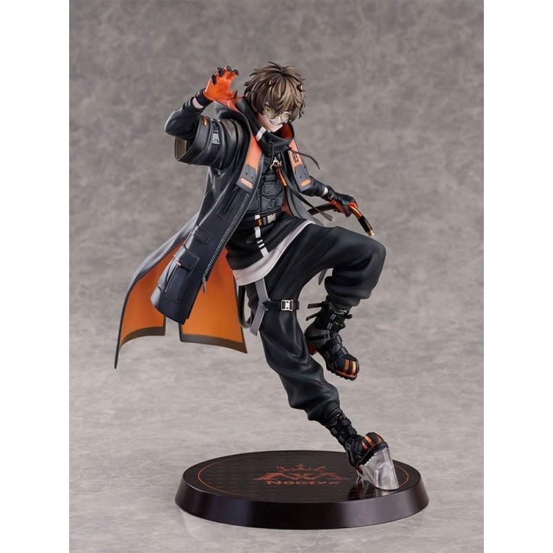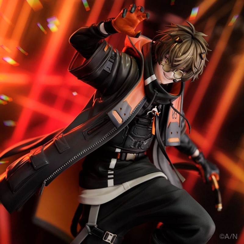 La figura representa a Alban Knox luciendo un estiloso abrigo negro con detalles interiores en color naranja, combinado con pantalones oscuros y botas robustas. Su expresión y pose dinámica reflejan su personalidad única, haciendo de esta pieza un elemento indispensable para cualquier fan o coleccionista de Nijisanji. Además, el producto viene en una caja con ventana, ideal para exhibir sin necesidad de abrir.
