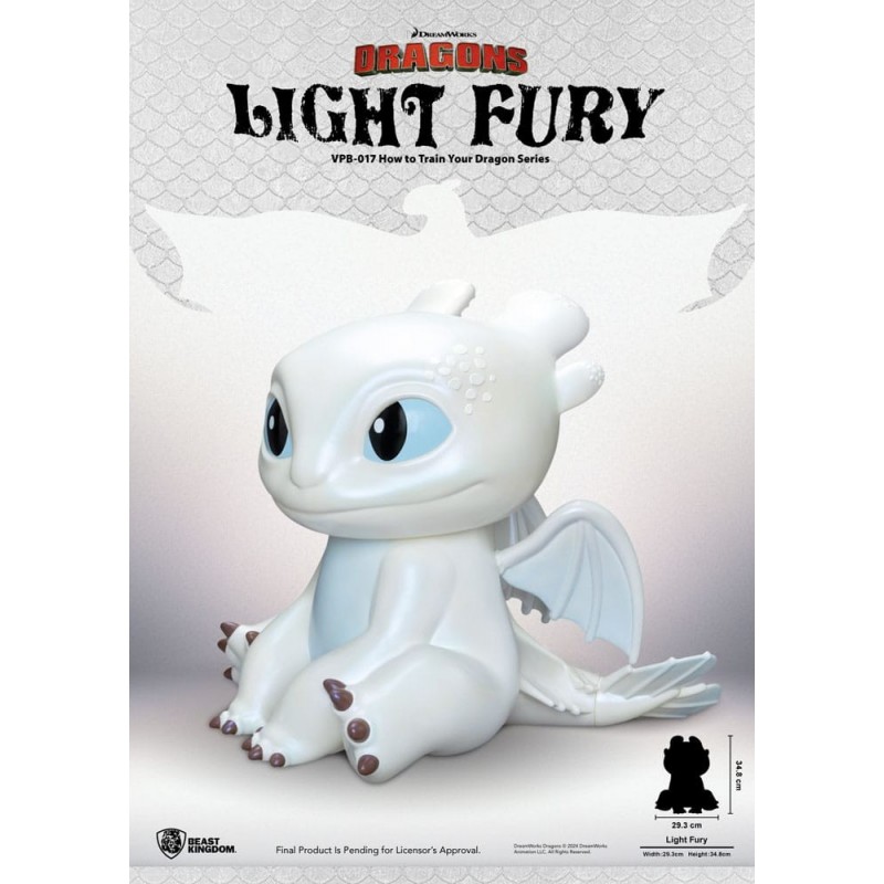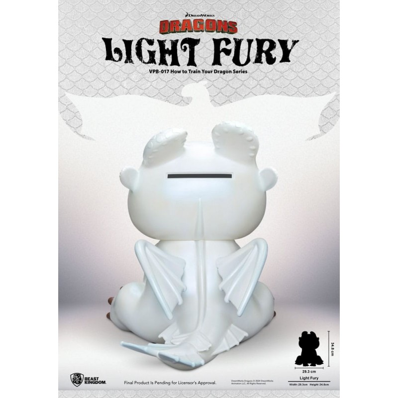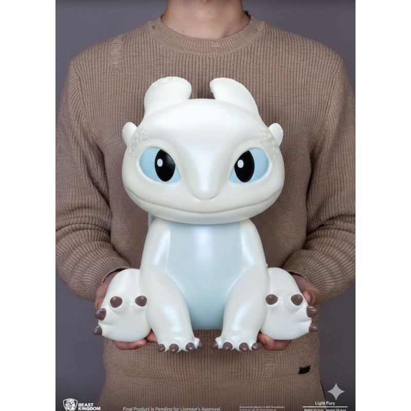 Descubre la magia de "Cómo Entrenar a tu Dragón" con esta encantadora hucha de Light Fury. Fabricada por Beast Kingdom, esta pieza de colección está elaborada en vinilo de alta calidad. Con un tamaño de aproximadamente 35 cm, captura la esencia del amado personaje de la franquicia. Su diseño blanco perlado y los grandes ojos azules aportan un toque de dulzura y autenticidad.