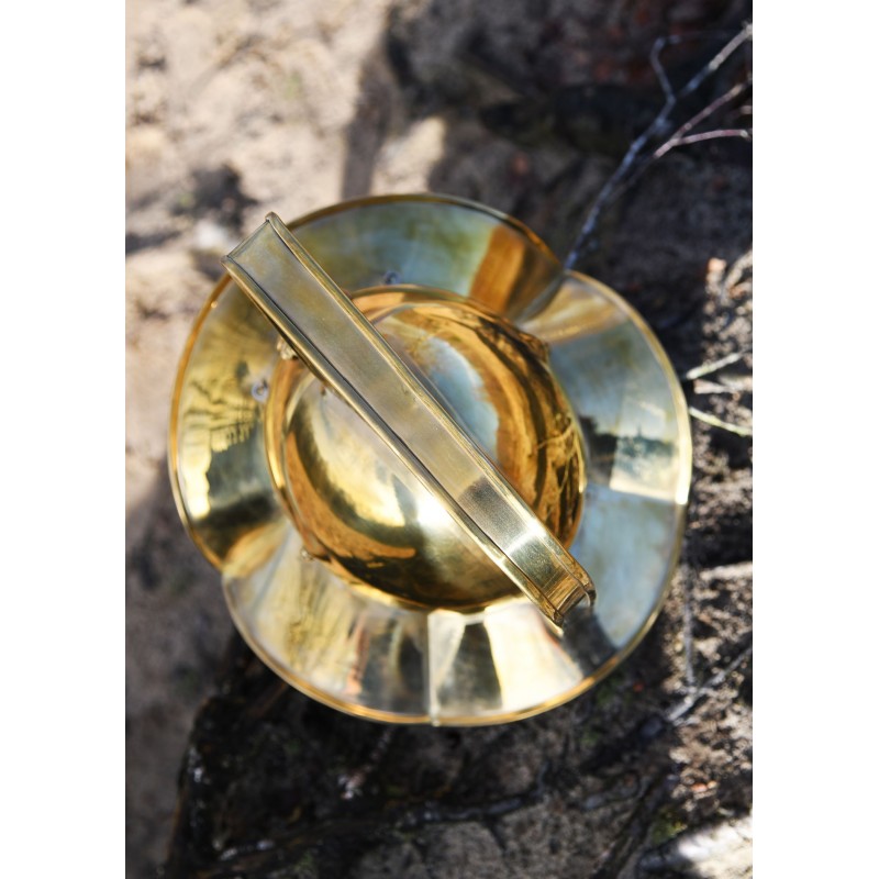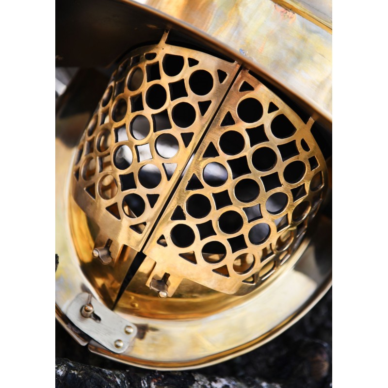 Este casco no solo es una pieza espectacular de exhibición, sino que también es funcional y puede ser utilizado en eventos de recreación histórica. Su confección en latón le proporciona una durabilidad excepcional, mientras que los detalles ornamentales aseguran que destaque en cualquier colección.