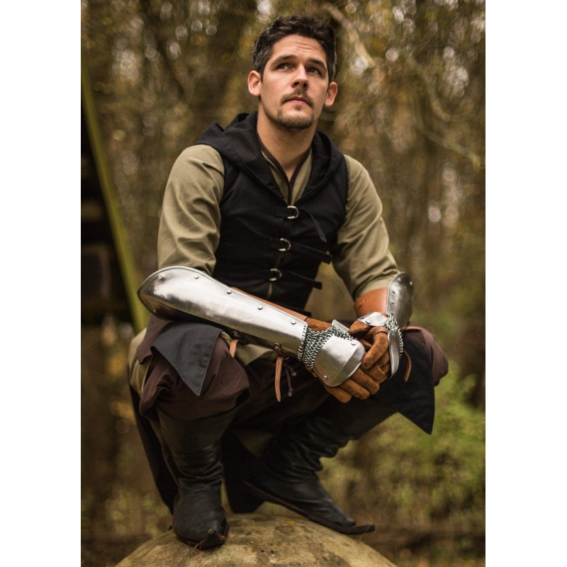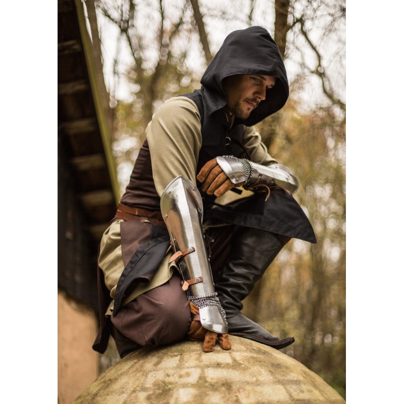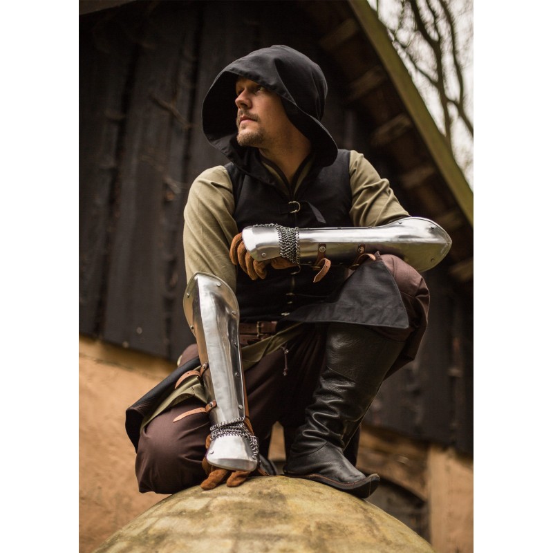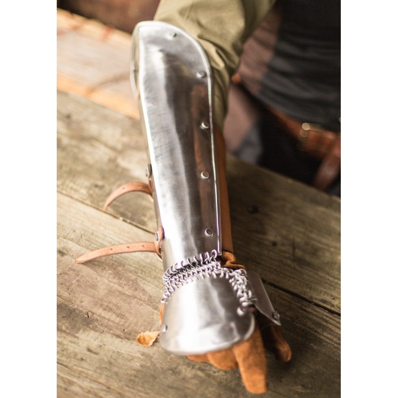 Los Bazuband de acero pulido son la opción perfecta para quienes buscan protección en los brazos sin la pesadez de los guanteletes. Este par de protectores está diseñado para defender el antebrazo, el pulgar y el dorso de la mano contra golpes y otros impactos. Fabricados con acero de 1 mm de grosor, cuentan con correas de cuero con hebillas para un ajuste personalizado y seguro, además de estar cuidadosamente remachados y sin bordes afilados, lo que los hace seguros para armas de LARP.