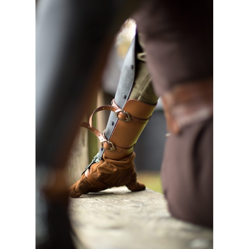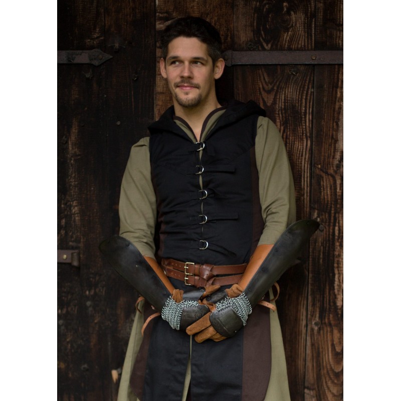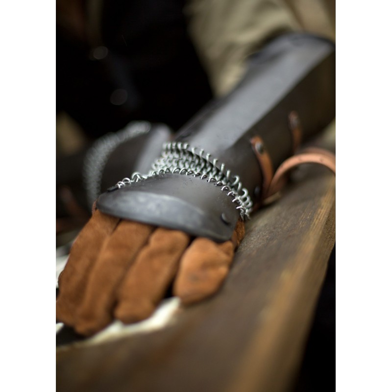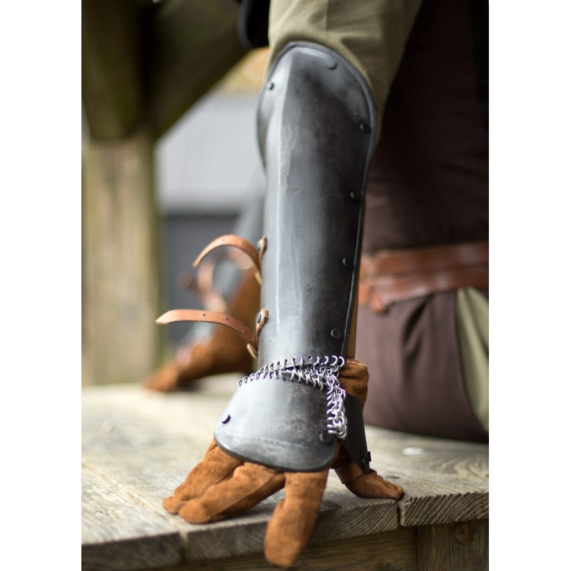 La protección de brazo Bazuband de acero oscuro de Epic Armoury es ideal para aquellos que buscan una alternativa más ligera a los guanteletes. Esta pieza de armadura protege eficazmente el antebrazo, el pulgar y el dorso de la mano contra golpes de espada y otros impactos. Al estar fabricada con acero oscuro de 1 mm de grosor, remaches y bordes lisos, es segura para usar con armas de LARP. Las correas de cuero con hebillas permiten un ajuste personalizado, y las cadenas que conectan los brazales con la protección de mano ofrecen libertad de movimiento y protección adicional.