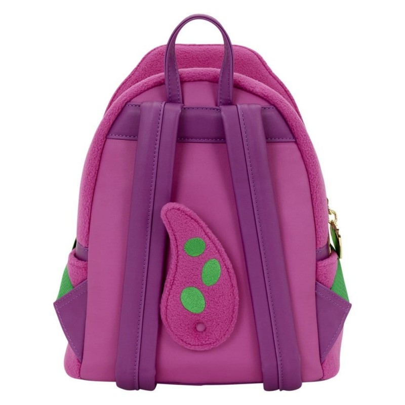 Descubre la encantadora mochila mini de Barney fabricada por Loungefly, perfecta para los verdaderos fans del querido personaje. Con un diseño vibrante, esta mochila captura toda la esencia de Barney en un lila brillante, mientras que el bolsillo frontal resalta en color verde, simulando su alegre barriga. Las dimensiones compactas de 23 x 27 x 11 cm la hacen ideal para llevar tus pertenencias diarias con estilo.