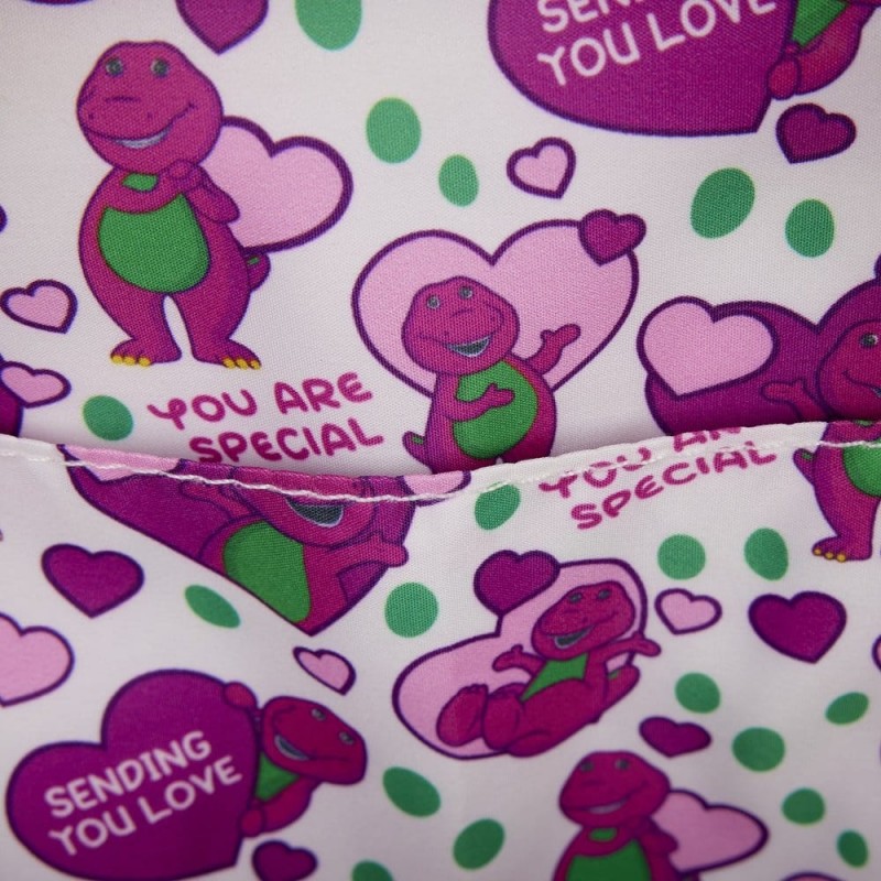 El material de alta calidad, compuesto de poliéster y cuero PU, garantiza durabilidad y resistencia, además de un acabado suave al tacto. La licencia oficial de Mattel asegura autenticidad, y los detalles, como los tiradores de cremallera en forma de corazón dorado con la inscripción ‘Barney’, añaden un toque distintivo y especial.