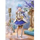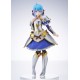La estatua presenta a Ruti con su distintivo cabello azul claro y un atuendo de guerrero que combina tonos de azul, plateado y dorado. La figura muestra una armadura detallada, destacando las hombreras y botas metálicas que le otorgan un aspecto heroico. El traje se enriquece con detalles dorados que resaltan sobre el fondo plateado, mientras que las mangas y la falda añaden un toque de elegancia al diseño.