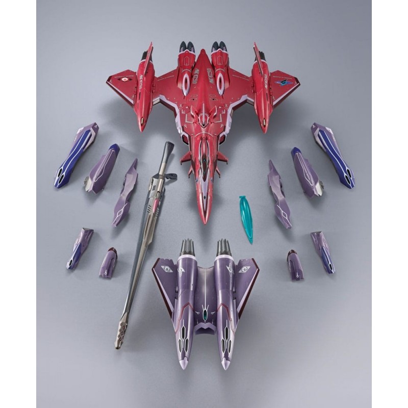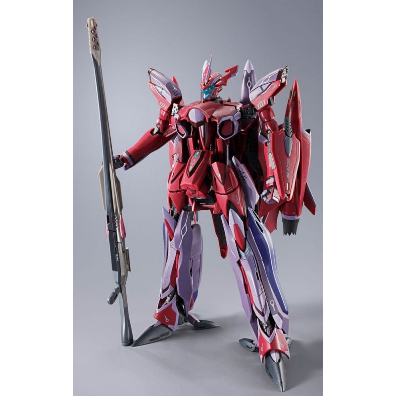 Explora el universo de Macross con la figura DX Chogokin VF-27 Gamma SP Super Lucifer. Esta impresionante figura articulada de 25 cm de Bandai Tamashii Nations es una pieza esencial para cualquier fan del anime. Su diseño exquisito mezcla tonos rojos y morados, capturando la esencia del Valkyrie de Brera Sterne.