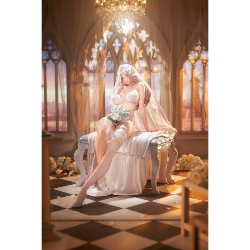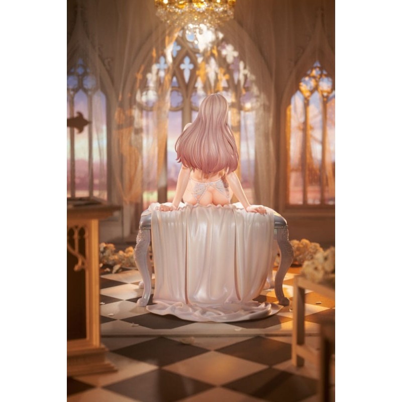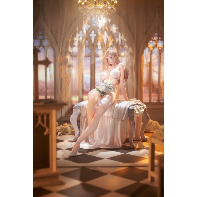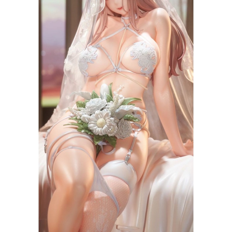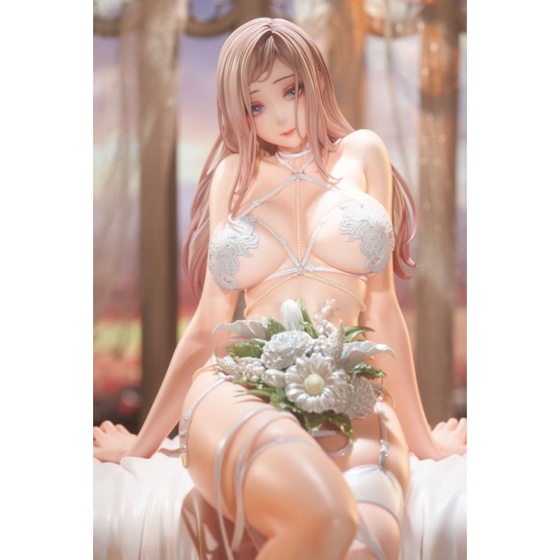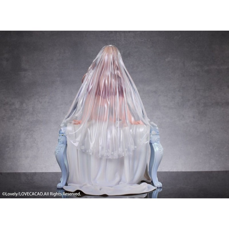 Explora la delicadeza de esta estatua PVC 1/4 Marry me, ilustrada por LOVECACAO. Con un tamaño aproximado de 31 cm, esta pieza es una auténtica obra de arte en el mundo del manga y anime. La figura presenta a una elegante joven sentada en un banco cubierto con un paño blanco, luciendo un conjunto íntimo decorado con delicados detalles florales, y un velo transparente que añade un toque romántico.