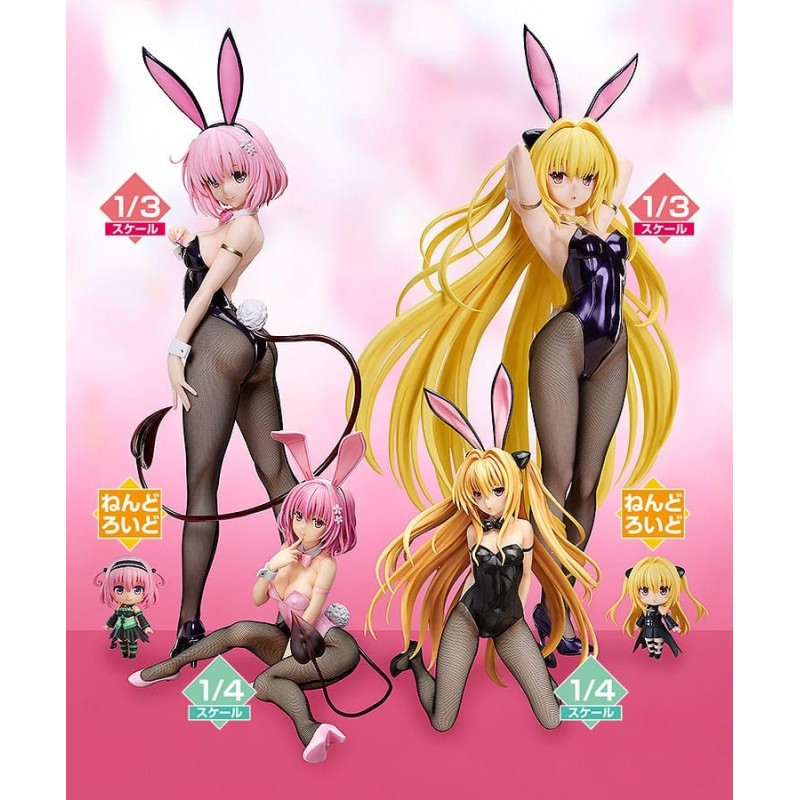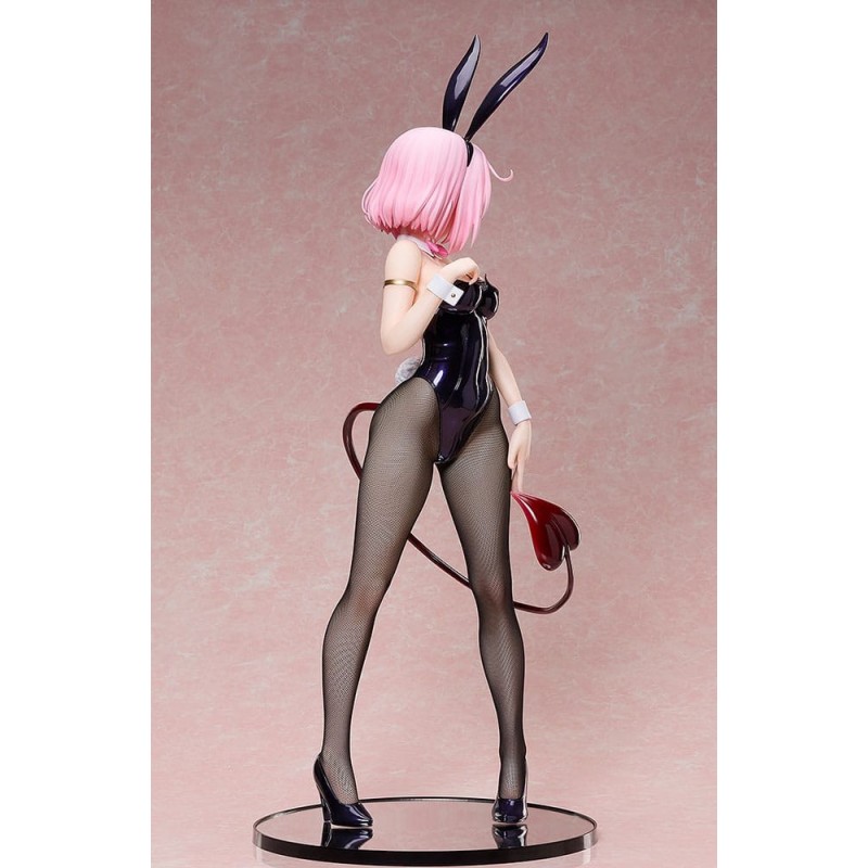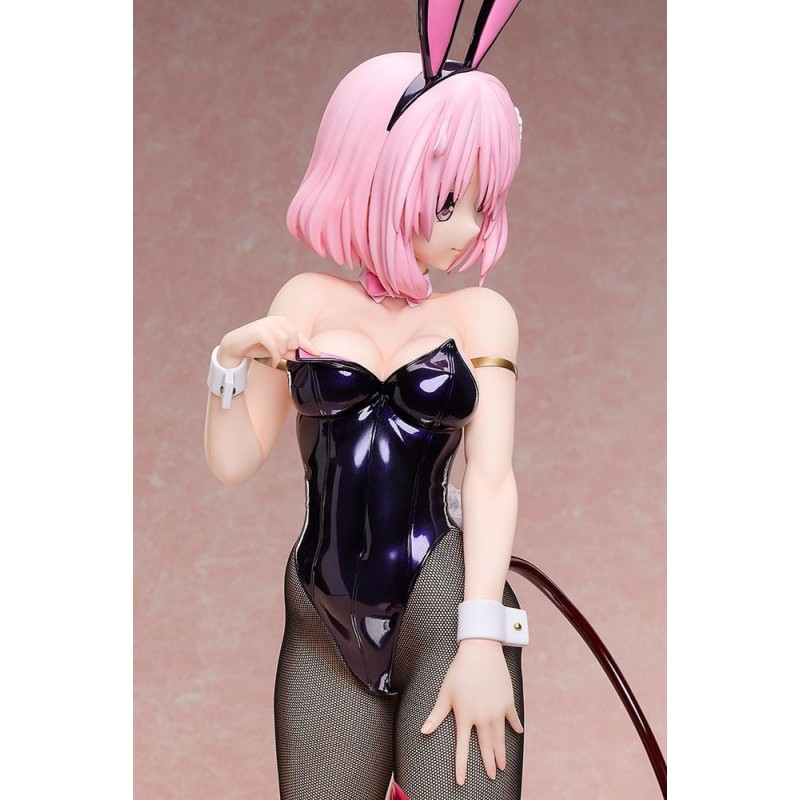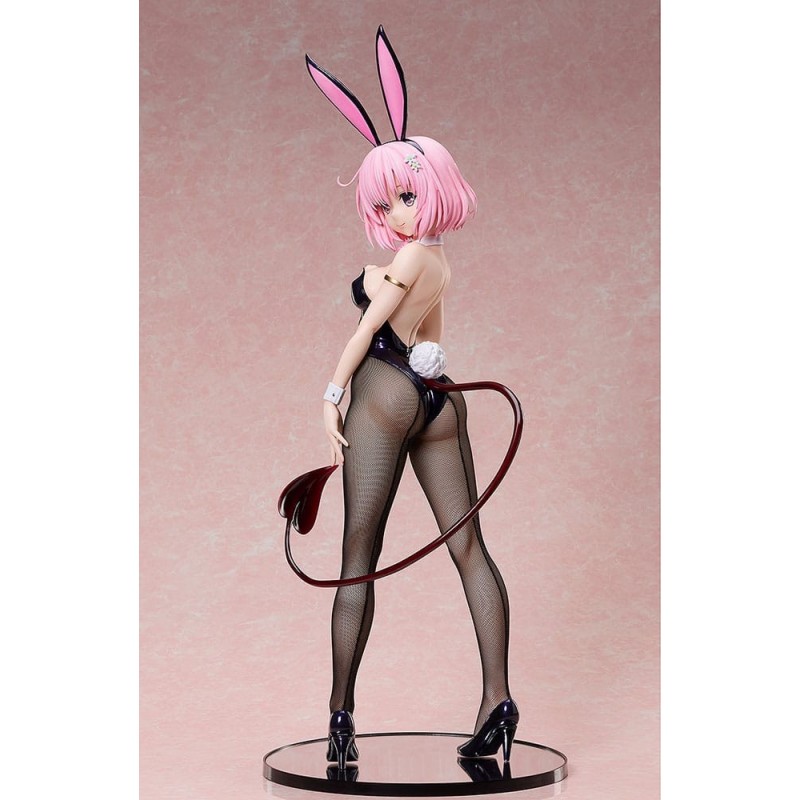 Vestida en un traje de conejita, Momo luce orejas de conejo, un corsé negro brillante y pantimedias de malla, enfatizando un estilo elegante y sofisticado. La figura está diseñada con gran atención a los detalles, como su cabello rosado delicadamente esculpido y un gesto coqueto que refleja su personalidad de la serie.