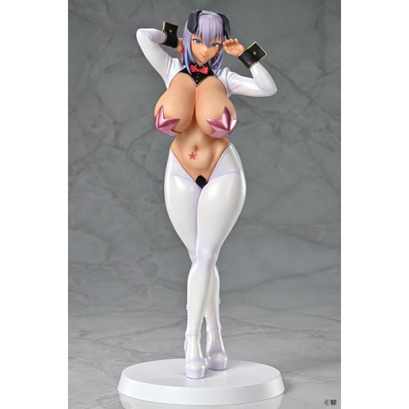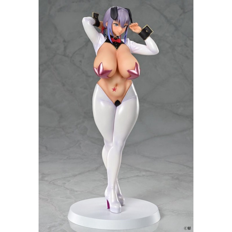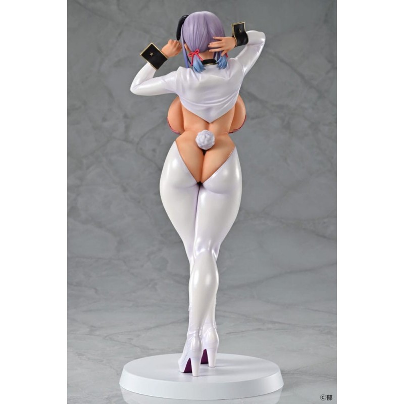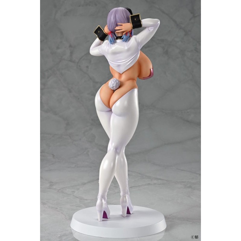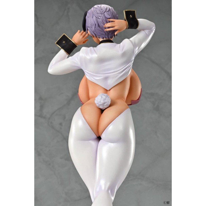 El diseño de la estatua presenta un toque audaz y sensual con un atuendo que recuerda a un traje de conejita, acentuado por detalles en color blanco, rosa y negro. La figura tiene características realistas como un cabello lavanda, una expresión seductora, y detalles que capturan la esencia del personaje original. Esta pieza está licenciada oficialmente y es perfecta para los fans del manga y anime, así como para aquellos que buscan un regalo único y especial.