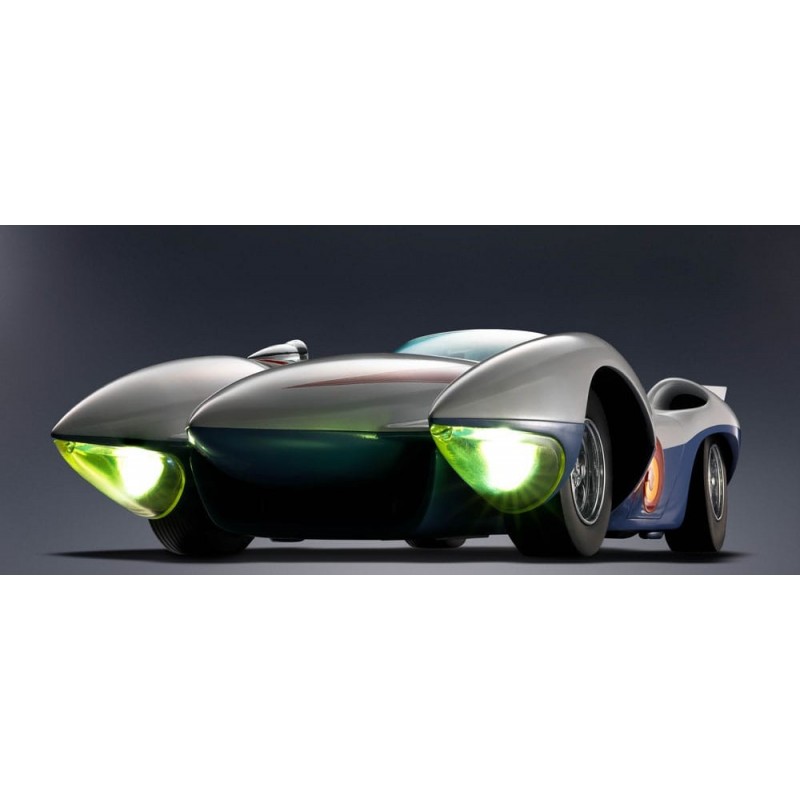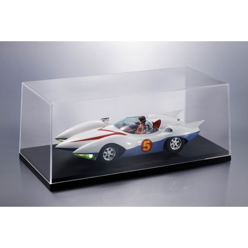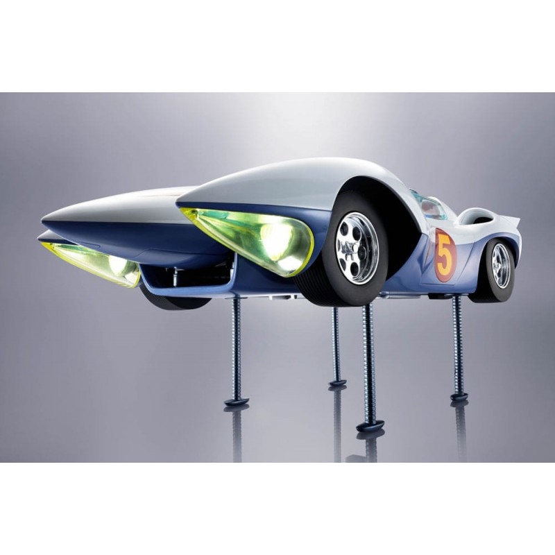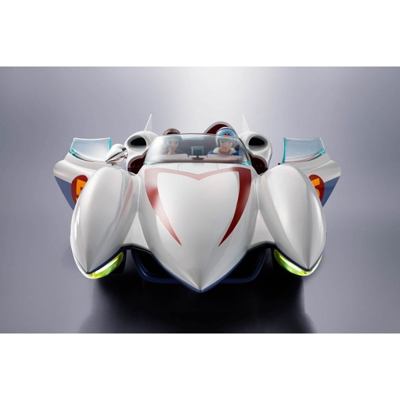 El Mach 5 presenta un acabado impecable con sus distintivos colores blanco y rojo, faros delanteros funcionales y detalles precisos en el interior, como el volante y el panel de control. Las puertas se abren para revelar el espacio detallado para los personajes, y el capó desmontable muestra el motor decorado del vehículo.