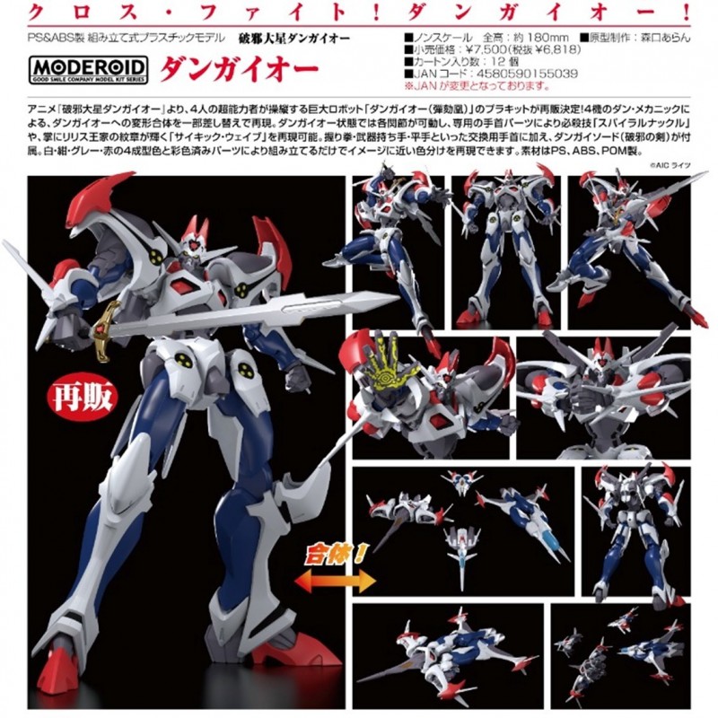 Descubre la figura model Kit Moderoid de Dangaioh de Good Smile Company, inspirada en el robot gigante de la serie anime "Hyper Combat Unit Dangaioh". Este modelo te permite armar tanto el mecha Dan Mechanic en su modo de vuelo como el poderoso mecha Dangaioh combinado. La maqueta, fabricada en ABS, mide aproximadamente 18 cm de alto. Incluye piezas de mano intercambiables para recrear las icónicas técnicas Spiral Knuckle y Psychic Wave, así como la emblemática espada Dangaioh y una base soporte para su exposición.