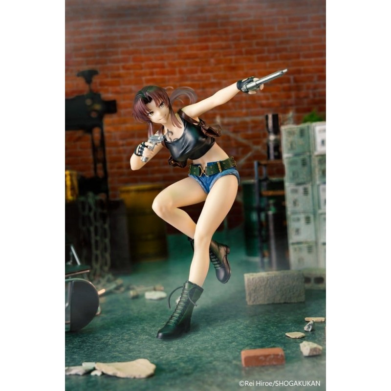 Admira la estatua de PVC de Revy del famoso anime Black Lagoon, con un tamaño aproximado de 16 cm. Esta figura captura a Revy en una pose dinámica y audaz, vistiendo su característico atuendo: un top negro ajustado, shorts de mezclilla cortos y botas de combate. Su expresión decidida y los detalles minuciosos, como el tatuaje en su brazo y las armas en sus manos, hacen de esta estatua un artículo imprescindible para los fans del anime.