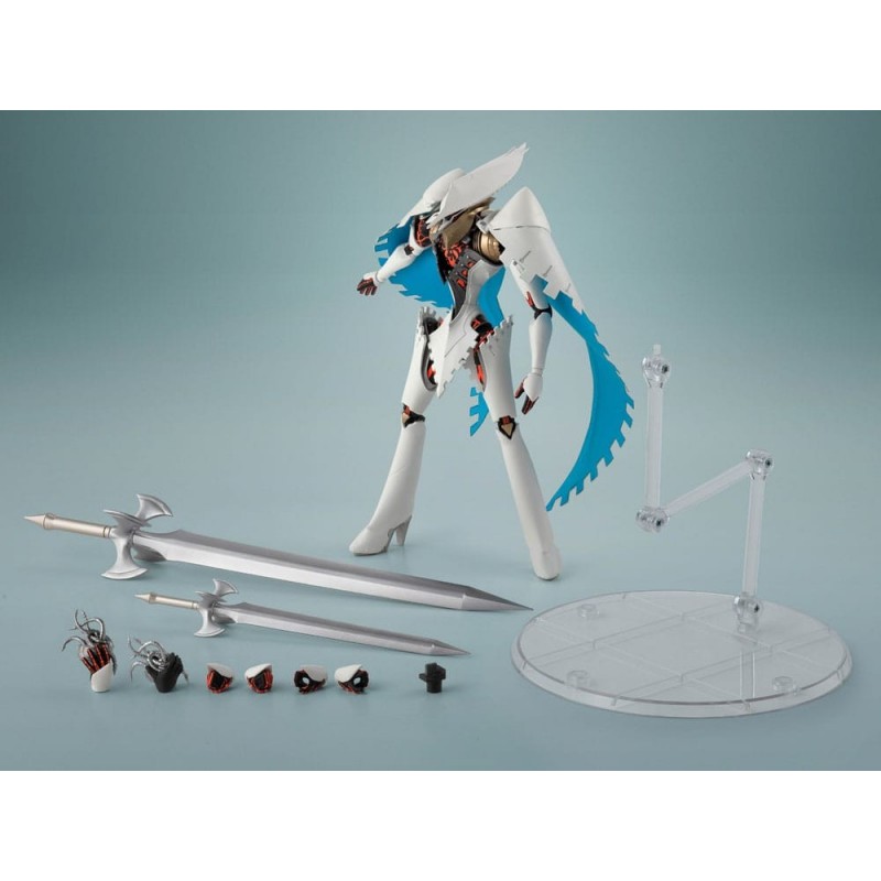 Presenta una armadura blanca con detalles en negro y rojo, un impresionante manto azul que agrega dinamismo, y una majestuosa espada plateada. La figura viene con diferentes accesorios, permitiendo recrear diversas poses icónicas.
