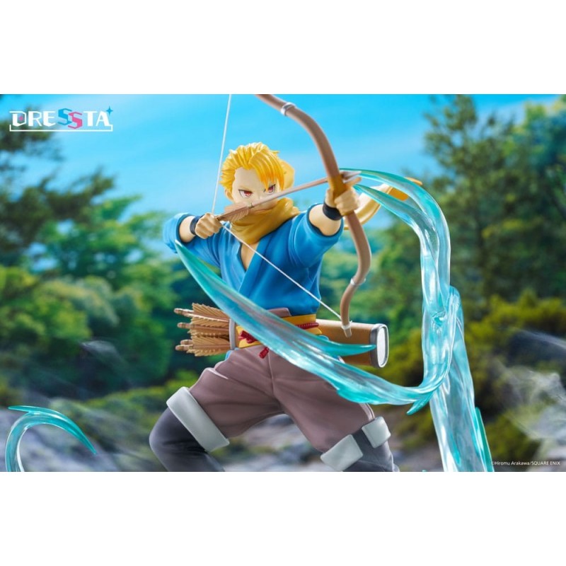 La estatua PVC Dressta Yuru de 21 cm es una impresionante representación del universo de Daemons of the Shadow Realm. Esta figura cuidadosamente elaborada captura a Yuru en una pose dinámica, sosteniendo su arco con determinación mientras una energía azul translúcida lo rodea, simulando movimientos de poder místico. El personaje está vestido con un atuendo aventurero: una camisa azul, pantalones cortos beige y botas altas negras, acentuados por una bufanda amarilla que se extiende en el viento.
