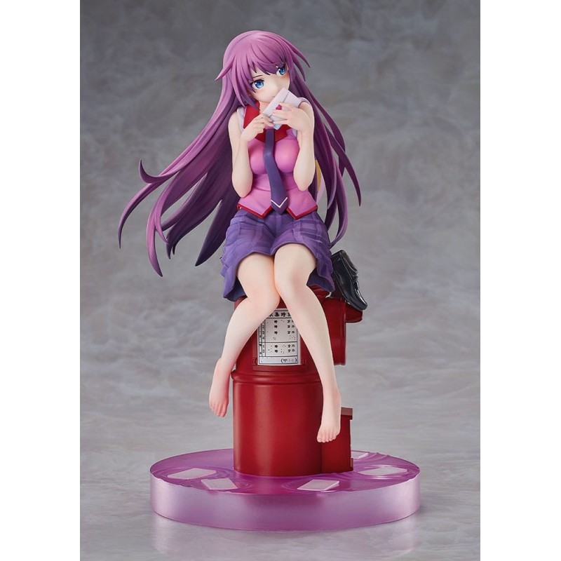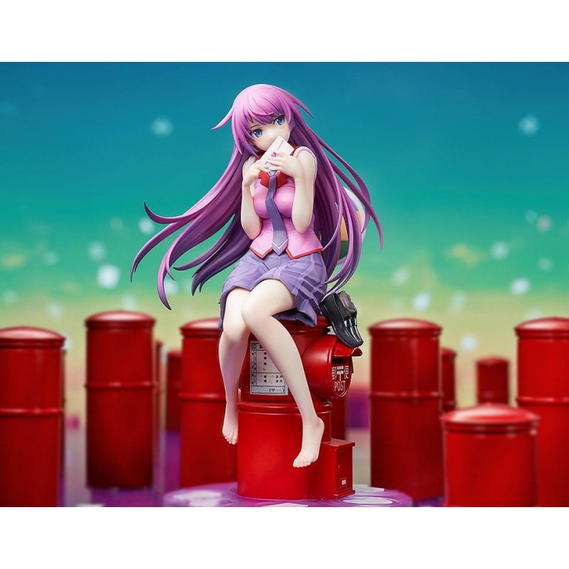 La figura muestra a Hitagi sentada en un buzón rojo, sosteniendo una carta, con su característico cabello largo y púrpura que añade dinamismo a la pieza. Su vestimenta combina tonos lilas y rosas que contrastan maravillosamente. Incluye una base estable y accesorios, presentados en una elegante caja con ventana. Fabricada por Good Smile Company, es una pieza con licencia oficial, ideal para coleccionistas de Manga y Anime.